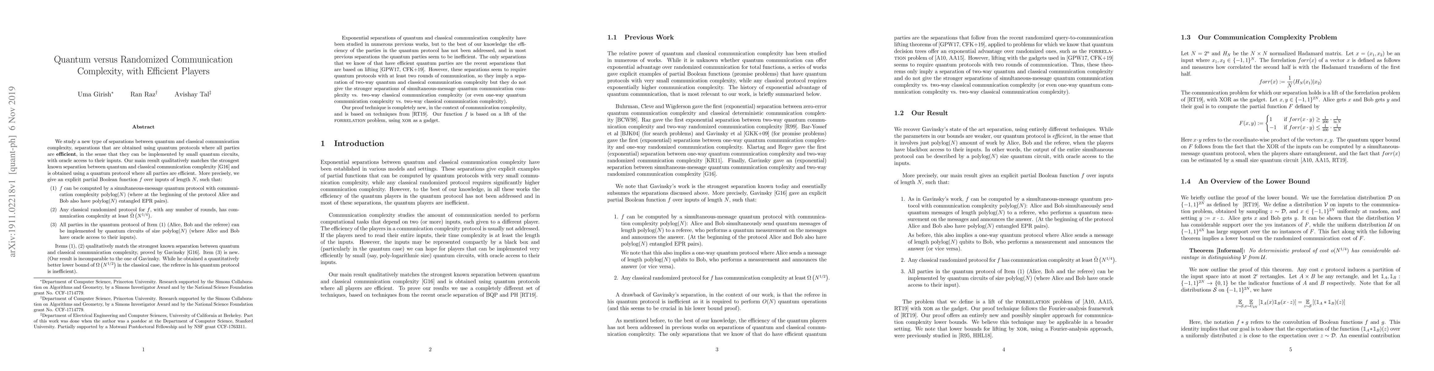 We study a new type of separation between quantum and classical communication complexity which is obtained using quantum protocols where all parties are efficient, in the sense that they can be implemented by small quantum circuits with oracle access to their inputs. More precisely, we give an explicit partial Boolean function that can be computed in the quantum-simultaneous-with-entanglement model of communication, however, every interactive randomized protocol is of exponentially larger cost. Furthermore, all the parties in the quantum protocol can be implemented by quantum circuits of small size with blackbox access to the inputs. Our result qualitatively matches the strongest known separation between quantum and classical communication complexity and is obtained using a quantum protocol where all parties are efficient.