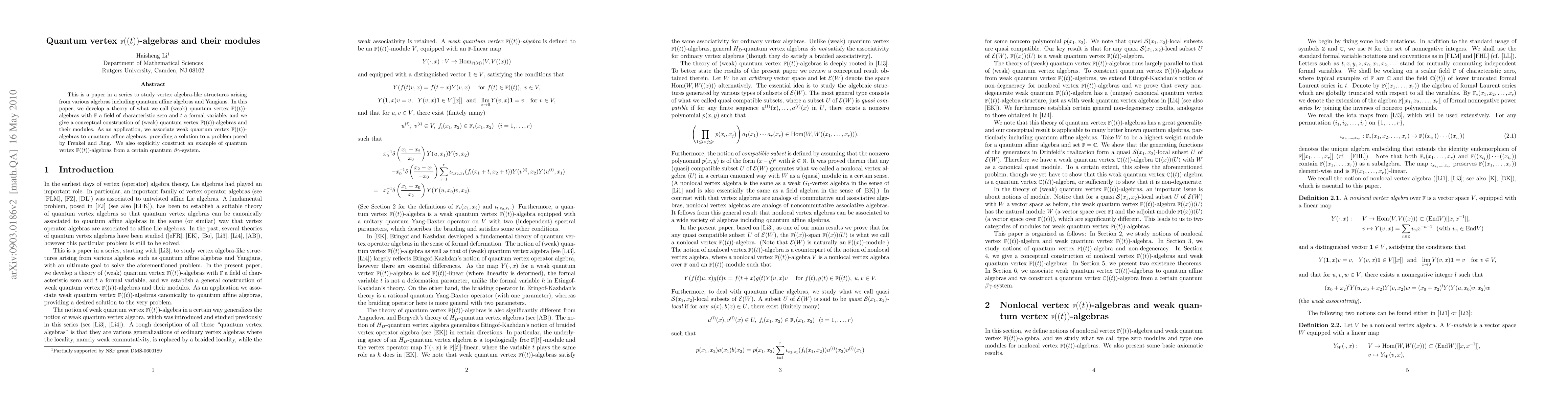 This is a paper in a series to study vertex algebra-like structures arising from various algebras including quantum affine algebras and Yangians. In this paper, we develop a theory of what we call (weak) quantum vertex $\F((t))$-algebras with $\F$ a field of characteristic zero and $t$ a formal variable, and we give a conceptual construction of (weak) quantum vertex $\F((t))$-algebras and their modules. As an application, we associate weak quantum vertex $\F((t))$-algebras to quantum affine algebras, providing a solution to a problem posed by Frenkel and Jing. We also explicitly construct an example of quantum vertex $\F((t))$-algebras from a certain quantum $\beta\gamma$-system.