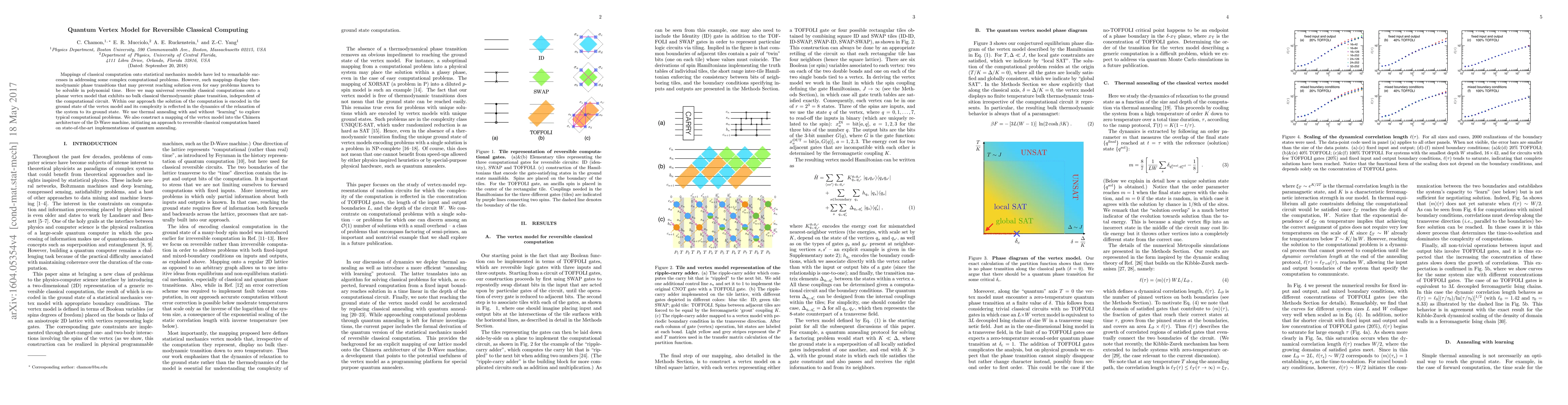 This paper proposes a quantum vertex model for reversible classical computing that avoids thermodynamic phase transitions, allowing efficient computation solutions. The model's ground state encodes computation solutions, and its complexity is reflected in the system's relaxation dynamics, explored via thermal annealing.