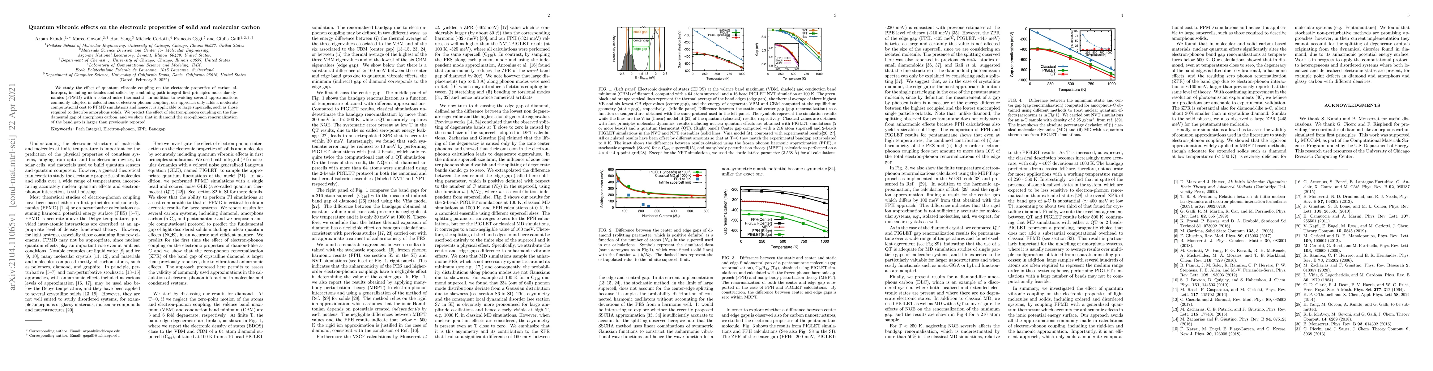 We study the effect of quantum vibronic coupling on the electronic properties of carbon allotropes, including molecules and solids, by combining path integral first principles molecular dynamics (FPMD) with a colored noise thermostat. In addition to avoiding several approximations commonly adopted in calculations of electron-phonon coupling, our approach only adds a moderate computational cost to FPMD simulations and hence it is applicable to large supercells, such as those required to describe amorphous solids. We predict the effect of electron-phonon coupling on the fundamental gap of amorphous carbon, and we show that in diamond the zero-phonon renormalization of the band gap is larger than previously reported.