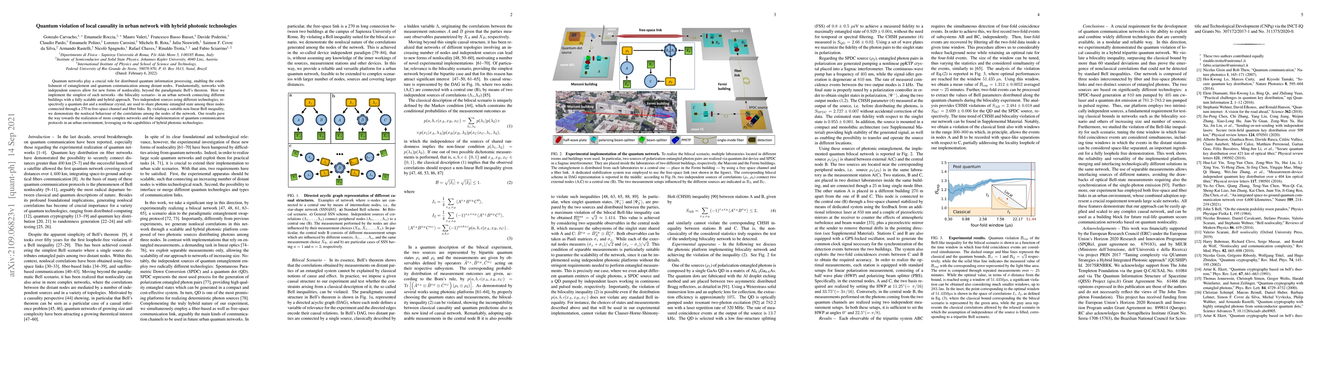 This paper demonstrates quantum violation of local causality in an urban network using hybrid photonic technologies, showing nonlocal correlations via a bilocality scenario with quantum dot and nonlinear crystal sources. The findings support the potential for scalable quantum communication networks in urban settings.