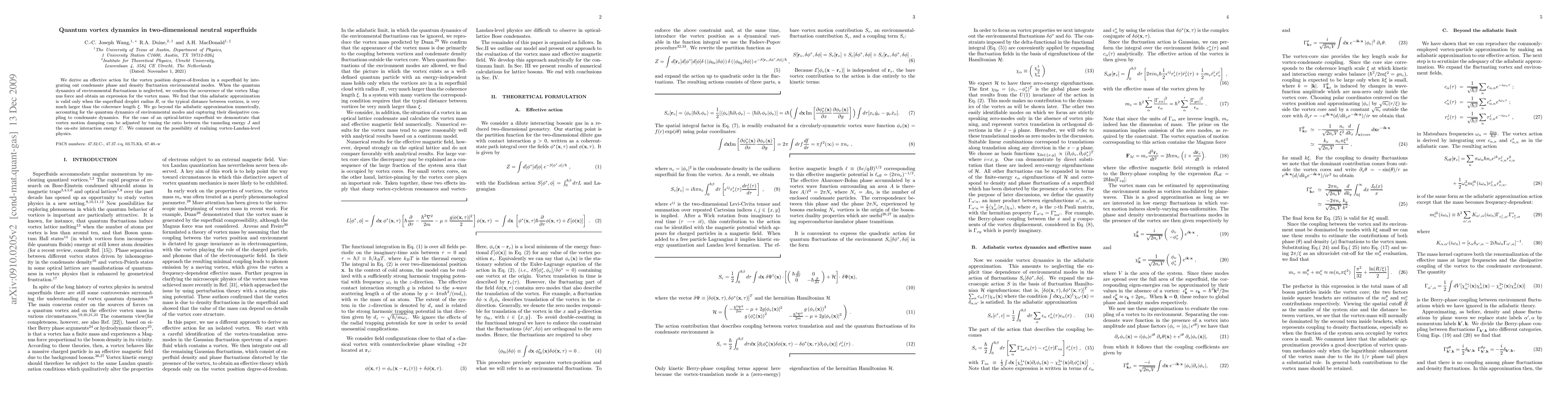 We derive an effective action for the vortex position degree-of-freedom in a superfluid by integrating out condensate phase and density fluctuation environmental modes. When the quantum dynamics of environmental fluctuations is neglected, we confirm the occurrence of the vortex Magnus force and obtain an expression for the vortex mass. We find that this adiabatic approximation is valid only when the superfluid droplet radius $R$, or the typical distance between vortices, is very much larger than the coherence length $\xi$. We go beyond the adiabatic approximation numerically, accounting for the quantum dynamics of environmental modes and capturing their dissipative coupling to condensate dynamics. For the case of an optical-lattice superfluid we demonstrate that vortex motion damping can be adjusted by tuning the ratio between the tunneling energy $J$ and the on-site interaction energy $U$. We comment on the possibility of realizing vortex Landau level physics.