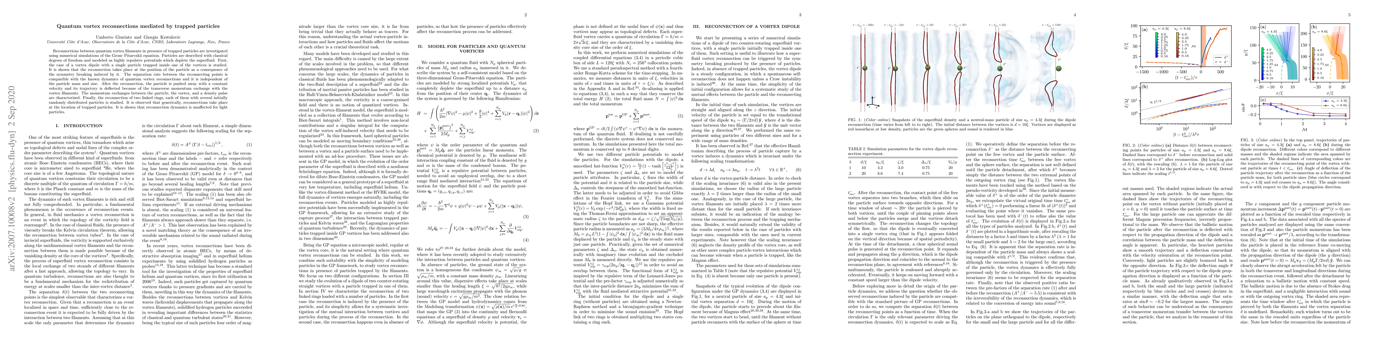 Reconnections between quantum vortex filaments in presence of trapped particles are investigated using numerical simulations of the Gross--Pitaevskii equation. Particles are described with classical degrees of freedom and modeled as highly repulsive potentials which deplete the superfluid. First, the case of a vortex dipole with a single particle trapped inside one of the vortices is studied. It is shown that the reconnection takes place at the position of the particle as a consequence of the symmetry breaking induced by it. The separation rate between the reconnecting points is compatible with the known dynamics of quantum vortex reconnections and it is independent of the particle mass and size. After the reconnection, the particle is pushed away with a constant velocity and its trajectory is deflected because of the transverse momentum exchange with the vortex filaments. The momentum exchanges between the particle, the vortex, and a density pulse are characterized. Finally, the reconnection of two linked rings, each of them with several initially randomly distributed particles is studied. It is observed that generically, reconnections take place at the location of trapped particles. It is shown that reconnection dynamics is unaffected for light particles.
