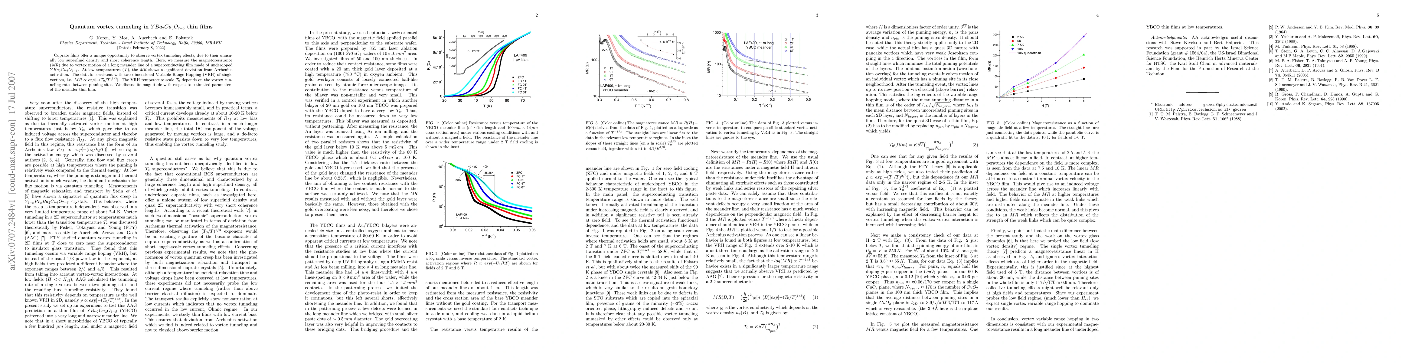 Cuprate films offer a unique opportunity to observe vortex tunneling effects, due to their unusually low superfluid density and short coherence length. Here, we measure the magnetoresistance (\textit{MR}) due to vortex motion of a long meander line of a superconducting film made of underdoped $YBa_2Cu_3O_{7-\delta}$. At low temperatures (\textit{T}), the \textit{MR} shows a significant deviation from Arrhenius activation. The data is consistent with two dimensional Variable Range Hopping (VRH) of single vortices, i.e. $MR\propto exp[-(T_0/T)^{1/3}]$. The VRH temperature scale $T_0$ depends on the vortex tunneling rates between pinning sites. We discuss its magnitude with respect to estimated parameters of the meander thin film.