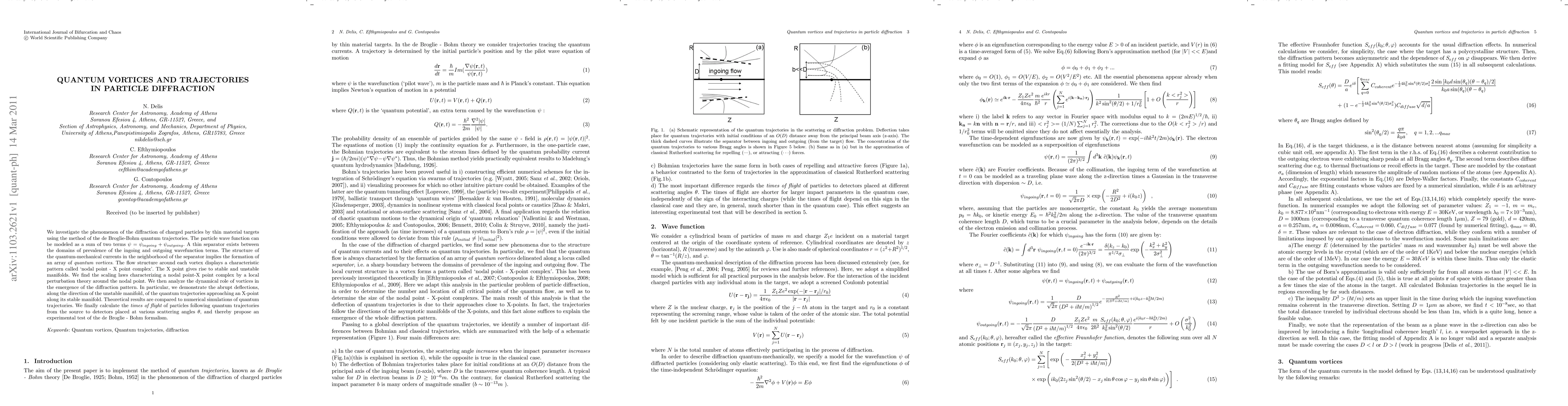 We investigate the phenomenon of the diffraction of charged particles by thin material targets using the method of the de Broglie-Bohm quantum trajectories. The particle wave function can be modeled as a sum of two terms $\psi=\psi_{ingoing}+\psi_{outgoing}$. A thin separator exists between the domains of prevalence of the ingoing and outgoing wavefunction terms. The structure of the quantum-mechanical currents in the neighborhood of the separator implies the formation of an array of \emph{quantum vortices}. The flow structure around each vortex displays a characteristic pattern called `nodal point - X point complex'. The X point gives rise to stable and unstable manifolds. We find the scaling laws characterizing a nodal point-X point complex by a local perturbation theory around the nodal point. We then analyze the dynamical role of vortices in the emergence of the diffraction pattern. In particular, we demonstrate the abrupt deflections, along the direction of the unstable manifold, of the quantum trajectories approaching an X-point along its stable manifold. Theoretical results are compared to numerical simulations of quantum trajectories. We finally calculate the {\it times of flight} of particles following quantum trajectories from the source to detectors placed at various scattering angles $\theta$, and thereby propose an experimental test of the de Broglie - Bohm formalism.