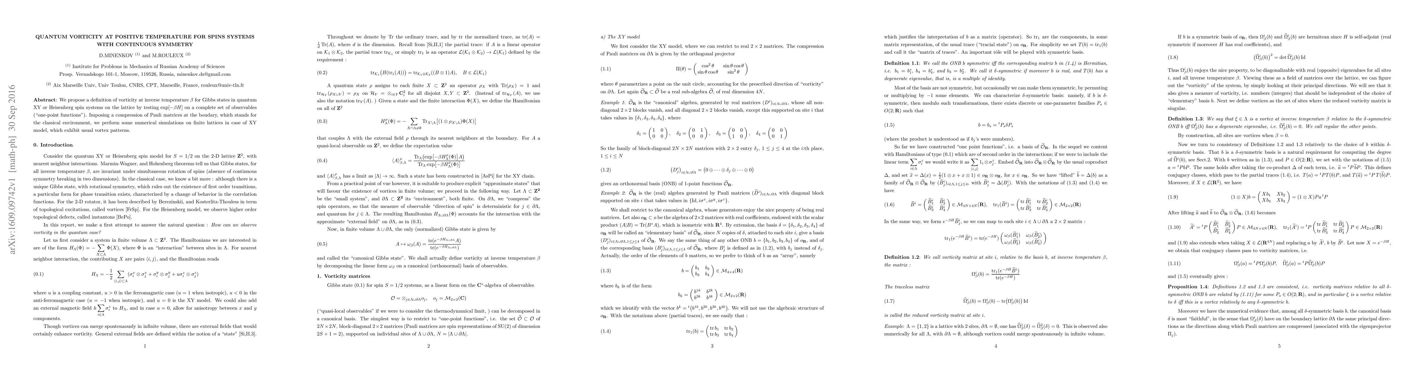 This research introduces a method to define quantum vorticity at positive temperature for spin systems with continuous symmetry, such as XY or Heisenberg models. Numerical simulations on finite lattices demonstrate typical vortex patterns using boundary conditions representing a classical environment.