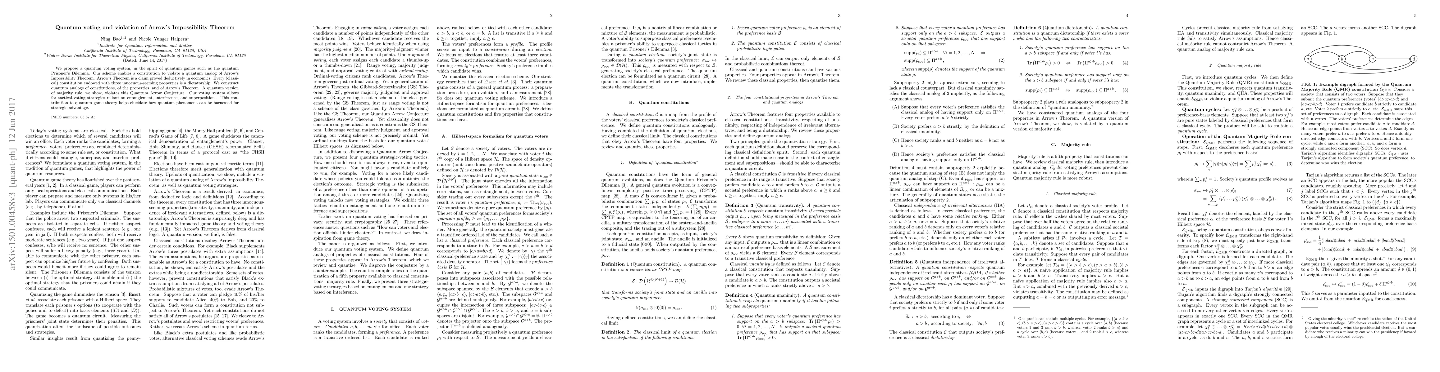We propose a quantum voting system, in the spirit of quantum games such as the quantum Prisoner's Dilemma. Our scheme enables a constitution to violate a quantum analog of Arrow's Impossibility Theorem. Arrow's Theorem is a claim proved deductively in economics: Every (classical) constitution endowed with three innocuous-seeming properties is a dictatorship. We construct quantum analogs of constitutions, of the properties, and of Arrow's Theorem. A quantum version of majority rule, we show, violates this Quantum Arrow Conjecture. Our voting system allows for tactical-voting strategies reliant on entanglement, interference, and superpositions. This contribution to quantum game theory helps elucidate how quantum phenomena can be harnessed for strategic advantage.