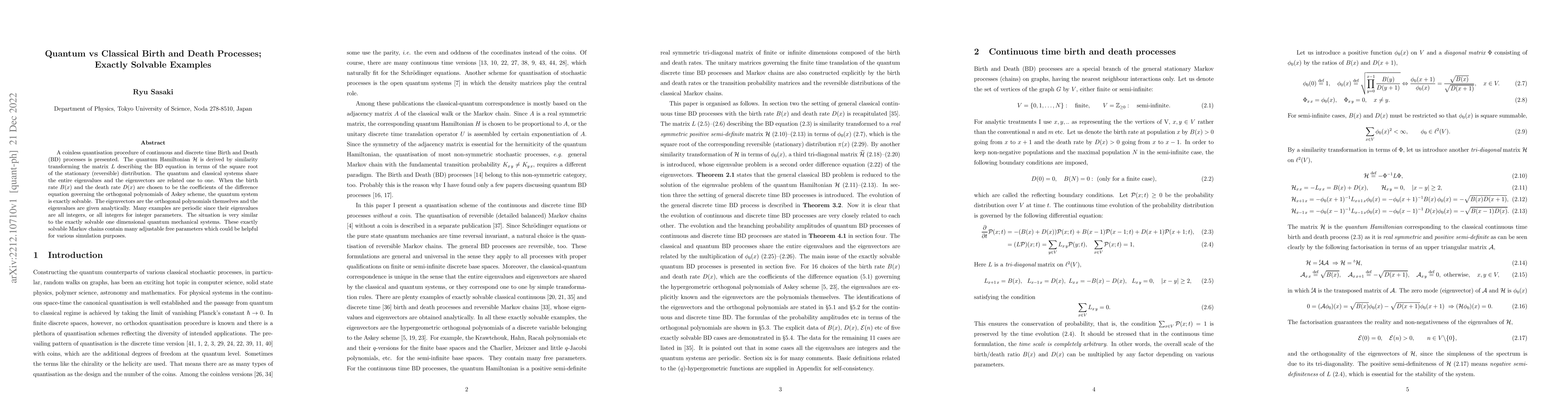 This paper quantizes classical Birth and Death processes using a coinless procedure, deriving a quantum Hamiltonian that shares eigenvalues and eigenvectors with the classical system. When birth and death rates match coefficients of Askey scheme orthogonal polynomials, the quantum system becomes exactly solvable, with orthogonal polynomials as eigenvectors and analytically determined eigenvalues.