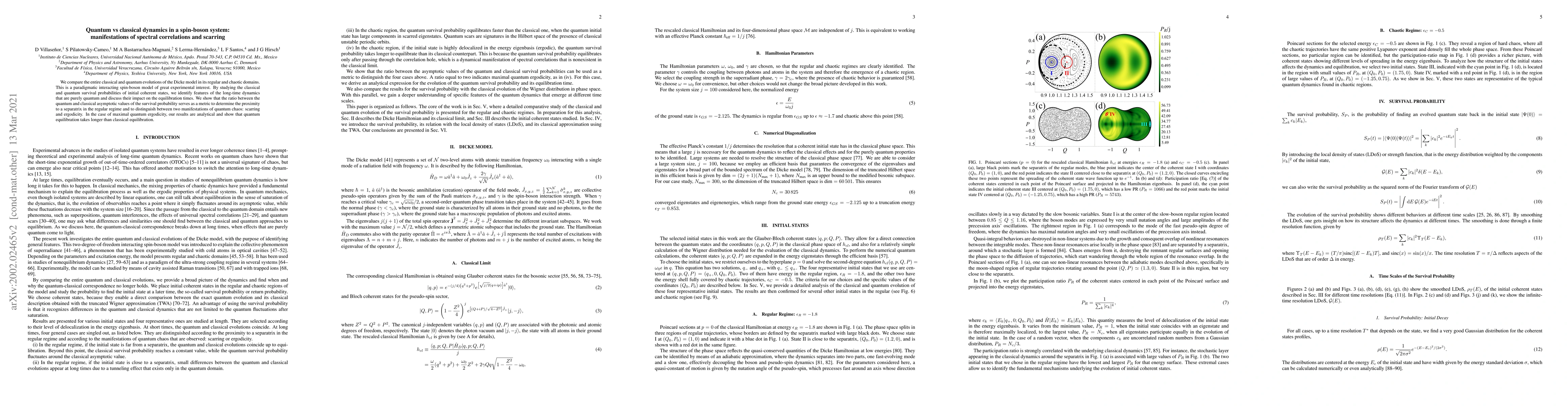 This paper compares classical and quantum dynamics of the Dicke model, identifying quantum-specific features like scarring and ergodicity through survival probabilities. It reveals that quantum equilibration times exceed classical ones, providing a metric to gauge proximity to separatrices and distinguish quantum chaos manifestations.