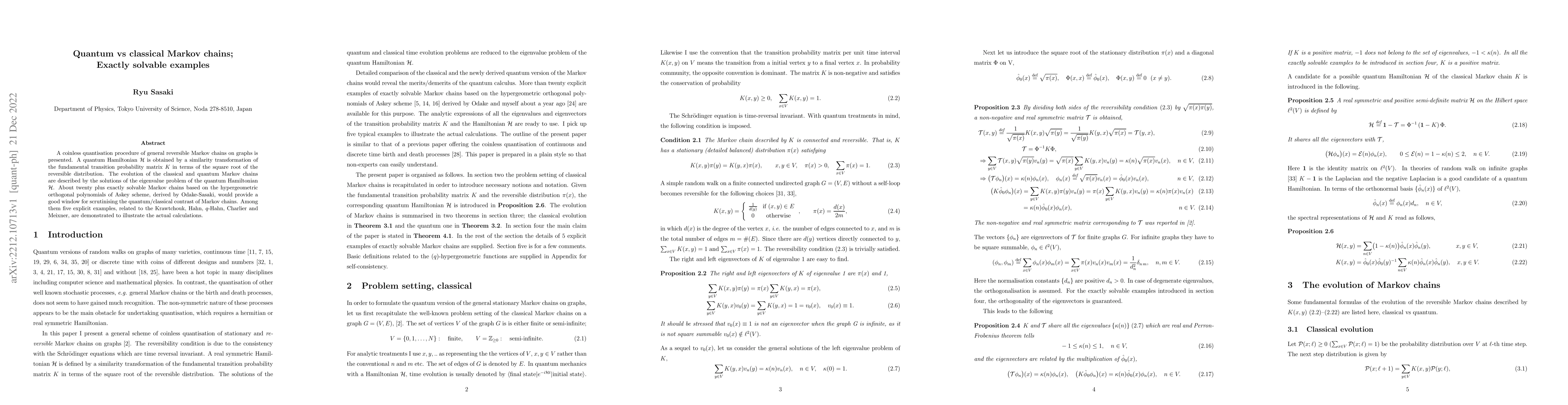 A coinless quantisation procedure of general reversible Markov chains on graphs is presented. A quantum Hamiltonian H is obtained by a similarity transformation of the fundamental transition probability matrix K in terms of the square root of the reversible distribution. The evolution of the classical and quantum Markov chains are described by the solutions of the eigenvalue problem of the quantum Hamiltonian H. About twenty plus exactly solvable Markov chains based on the hypergeometric orthogonal polynomials of Askey scheme, derived by Odake-Sasaki, would provide a good window for scrutinising the quantum/classical contrast of Markov chains. Among them five explicit examples, related to the Krawtchouk, Hahn, q-Hahn, Charlier and Meixner, are demonstrated to illustrate the actual calculations.