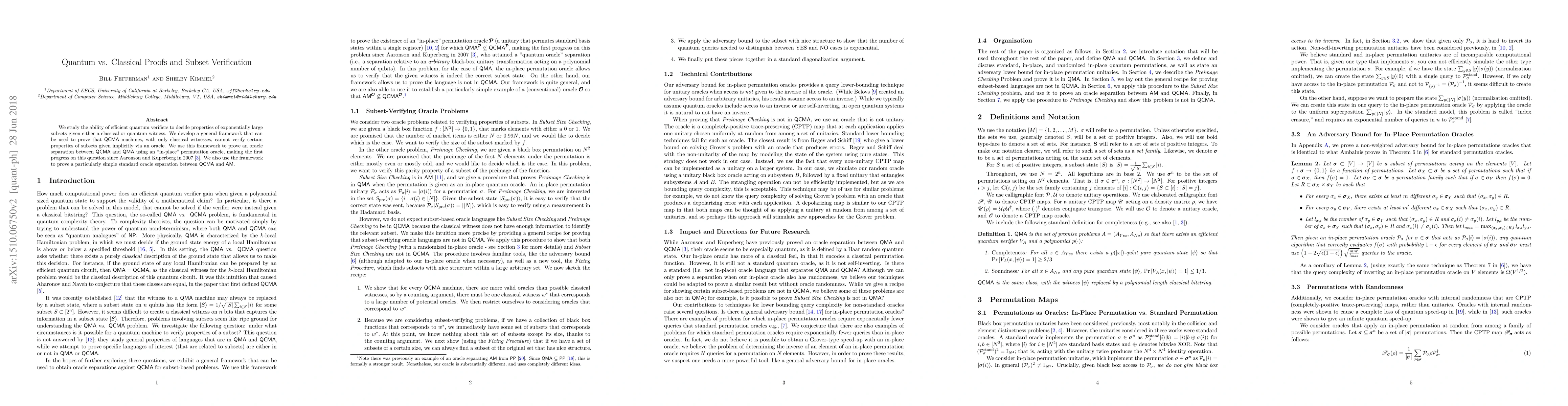 This paper explores quantum versus classical verification of exponentially large subsets, establishing a framework to show that QCMA machines cannot verify certain properties using classical witnesses. It demonstrates an oracle separation between QCMA and QMA, and also proves a simple oracle separation between QCMA and AM.