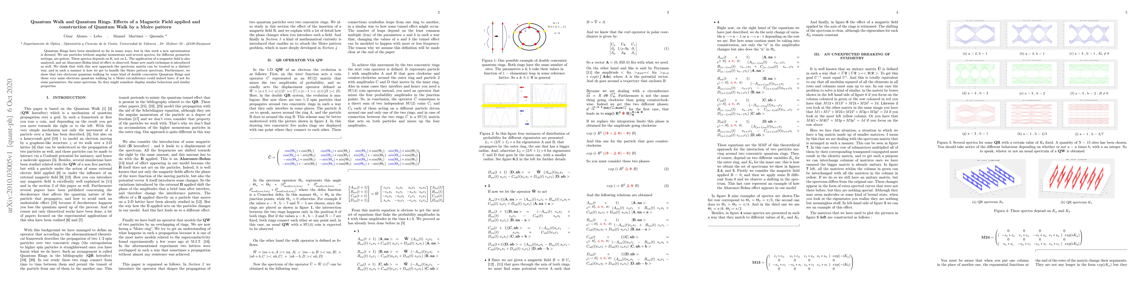 Quantum Rings have been simulated so far in many ways, but in this work a new aproximation is deemed. We use particles without angular momentum and several spectra, for different geometric settings, are gotten. These spectra depends on K, not on L. The application of a magnetic field is also analysed, and an Aharonov-Bohm kind of effect is observed. Some new math technique is introduced as well. We think that with this new approach the spectrum matrix can be treated in a distinct way, and in such a manner is how we get to handle the Moire pattern spectrum. Furthermore, we show that two electrons quantum walking by some kind of double concentric Quantum Rings and those very same electrons quantum walking by a Moire circunference could indeed have, if not for some parameters, the same spectrum. So they might somehow display similar behaviour and similar properties