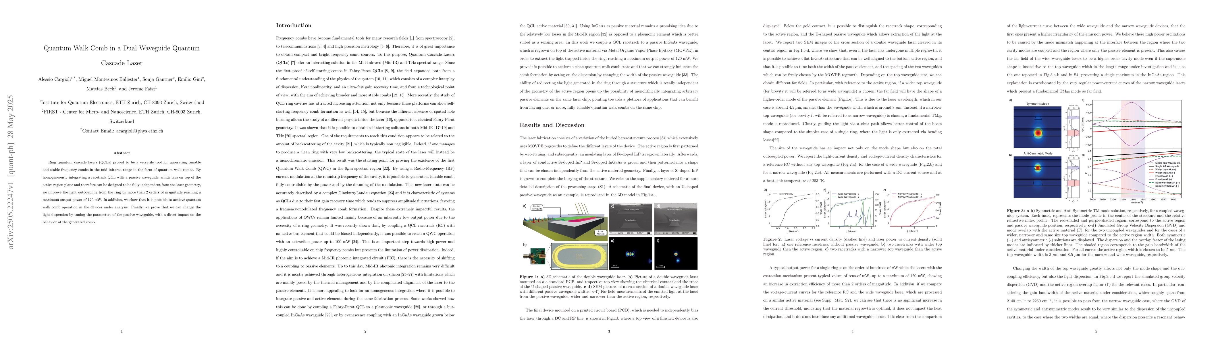 This work is novel due to the successful demonstration of quantum walk comb generation in a dual waveguide QCL, along with the ability to tune light dispersion via passive waveguide parameters.