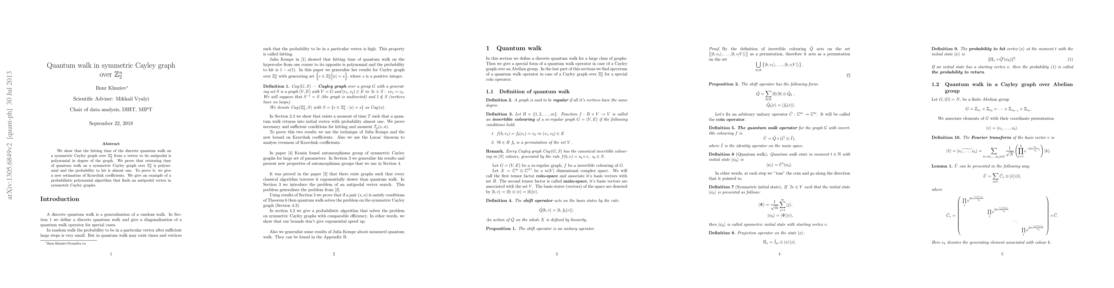 We show that the hitting time of the discrete quantum walk on a symmetric Cayley graph over $\Z_2^n $ from a vertex to its antipodal is polynomial in degree of the graph. We prove that returning time of quantum walk on a symmetric Cayley graph over $\Z_2^n $ is polynomial and the probability to hit is almost one. To prove it, we give a new estimation of Kravchuk coefficients. We give an example of a probabilistic polynomial algorithm that finds an antipodal vertex in symmetric Cayley graphs.