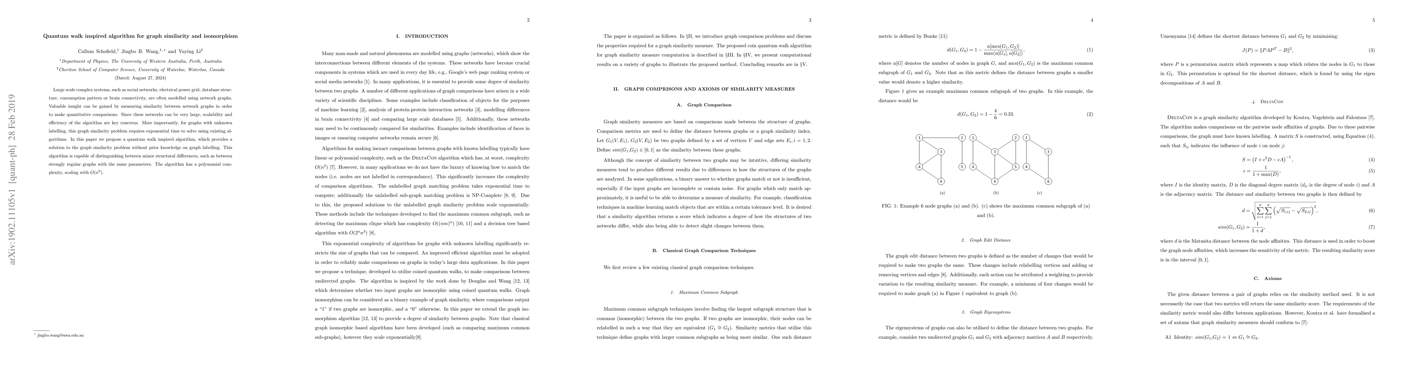 This paper proposes a quantum walk-inspired algorithm for efficiently measuring the similarity and isomorphism between large network graphs, addressing the scalability issue of existing methods. The algorithm operates with polynomial complexity, $O(n^9)$, and can distinguish minor structural differences without requiring prior knowledge of graph labeling.
