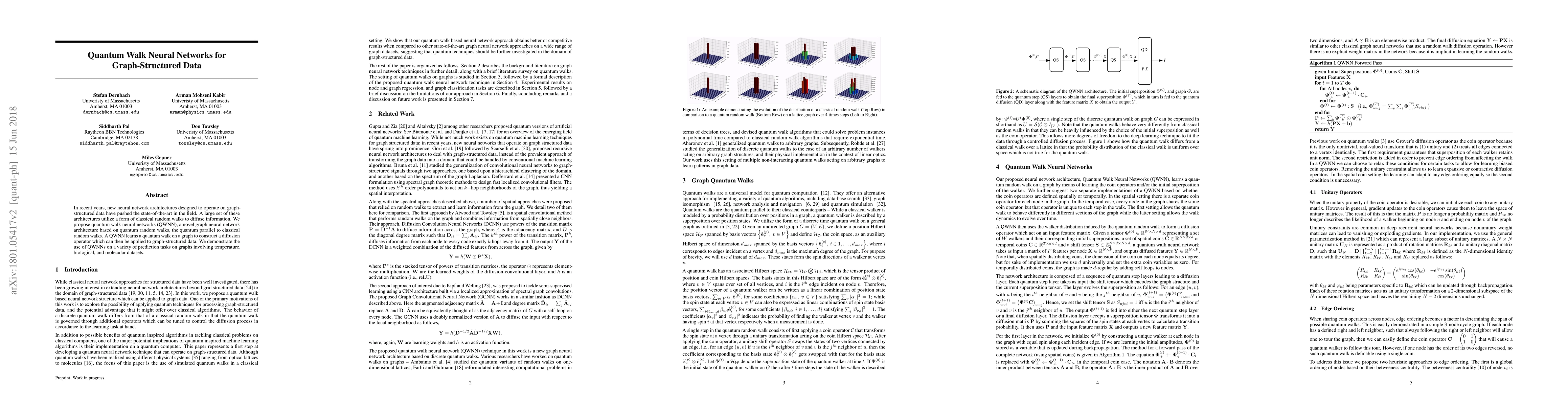 This paper introduces quantum walk neural networks (QWNN), a novel architecture based on quantum random walks for graph-structured data. The QWNN learns a quantum walk to construct a diffusion operator, demonstrating improved performance on various prediction tasks across temperature, biological, and molecular datasets.