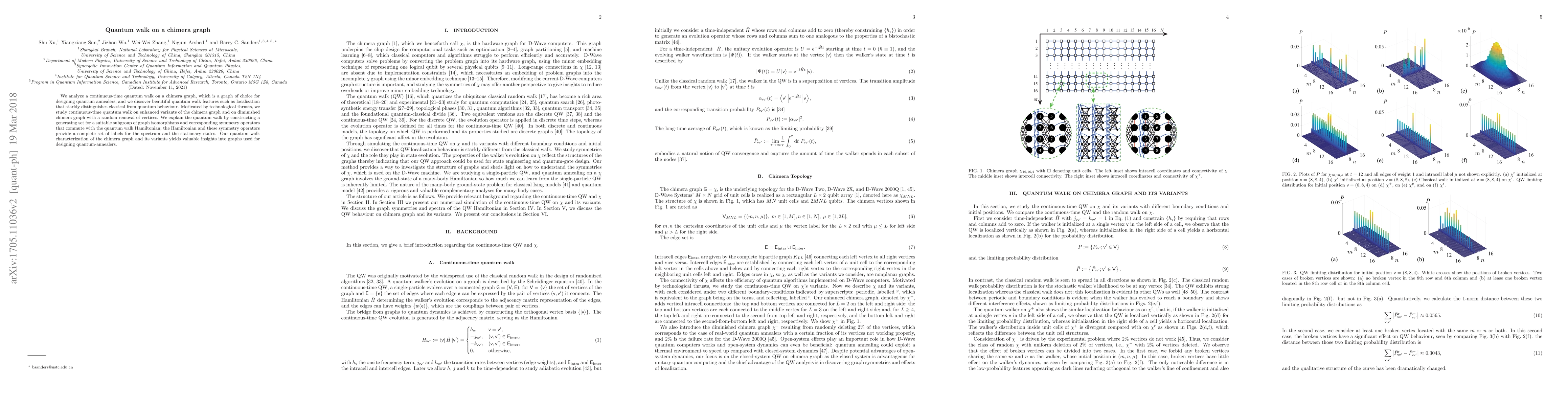 This paper investigates the continuous-time quantum walk on chimera graphs, revealing unique quantum features like localization. It explores enhanced and diminished variants of the chimera graph, providing insights into quantum-annealer design through a detailed analysis of the quantum-walk Hamiltonian and symmetry operators.