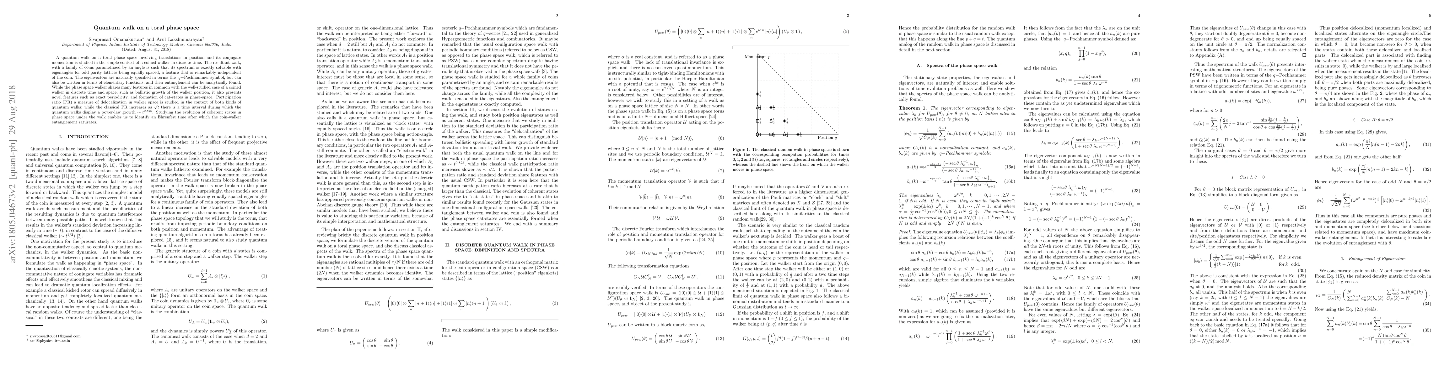 A quantum walk on a toral phase space involving translations in position and its conjugate momentum is studied in the simple context of a coined walker in discrete time. The resultant walk, with a family of coins parametrized by an angle is such that its spectrum is exactly solvable with eigenangles for odd parity lattices being equally spaced, a feature that is remarkably independent of the coin. The eigenvectors are naturally specified in terms the $q-$Pochhammer symbol, but can also be written in terms of elementary functions, and their entanglement can be analytically found. While the phase space walker shares many features in common with the well-studied case of a coined walker in discrete time and space, such as ballistic growth of the walker position, it also presents novel features such as exact periodicity, and formation of cat-states in phase-space. Participation ratio (PR) a measure of delocalization in walker space is studied in the context of both kinds of quantum walks; while the classical PR increases as $\sqrt{t}$ there is a time interval during which the quantum walks display a power-law growth $\sim t^{0.825}$. Studying the evolution of coherent states in phase space under the walk enables us to identify an Ehrenfest time after which the coin-walker entanglement saturates.