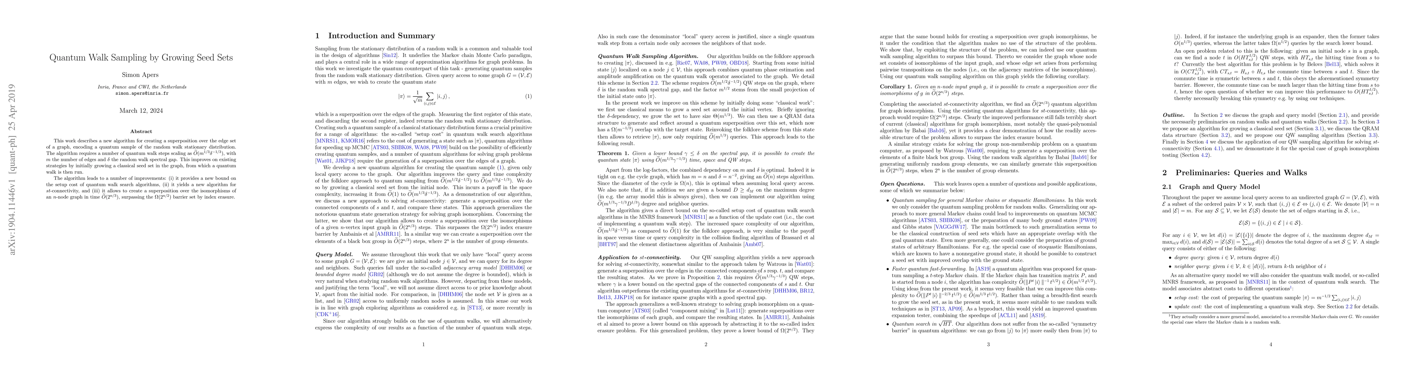 This work describes a new algorithm for creating a superposition over the edge set of a graph, encoding a quantum sample of the random walk stationary distribution. The algorithm requires a number of quantum walk steps scaling as $\widetilde{O}(m^{1/3} \delta^{-1/3})$, with $m$ the number of edges and $\delta$ the random walk spectral gap. This improves on existing strategies by initially growing a classical seed set in the graph, from which a quantum walk is then run. The algorithm leads to a number of improvements: (i) it provides a new bound on the setup cost of quantum walk search algorithms, (ii) it yields a new algorithm for $st$-connectivity, and (iii) it allows to create a superposition over the isomorphisms of an $n$-node graph in time $\widetilde{O}(2^{n/3})$, surpassing the $\Omega(2^{n/2})$ barrier set by index erasure.