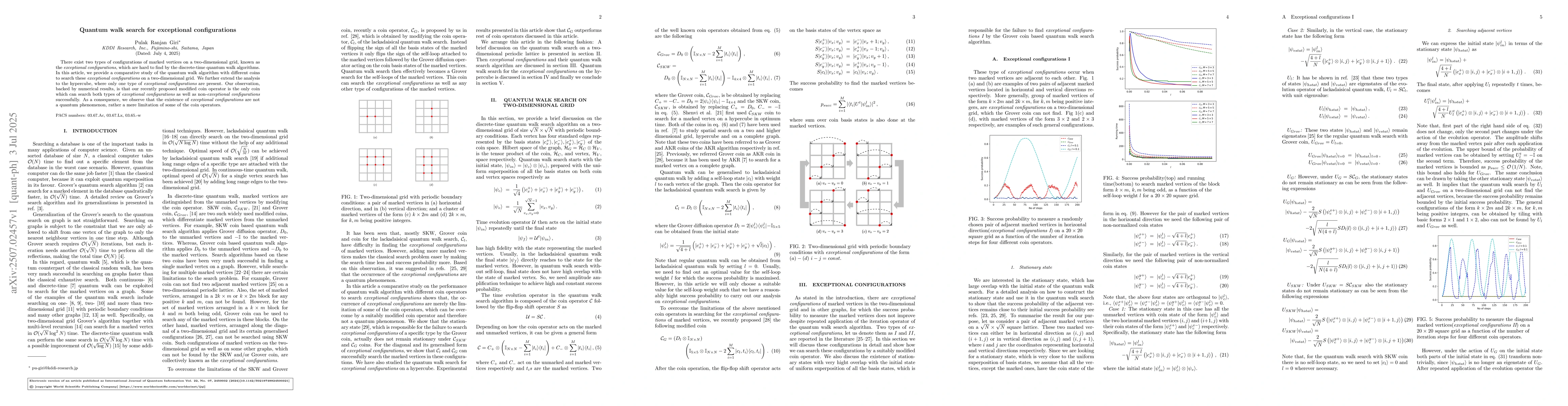 There exist two types of configurations of marked vertices on a two-dimensional grid, known as the {\it exceptional configurations}, which are hard to find by the discrete-time quantum walk algorithms. In this article, we provide a comparative study of the quantum walk algorithm with different coins to search these {\it exceptional configurations} on a two-dimensional grid. We further extend the analysis to the hypercube, where only one type of {\it exceptional configurations} are present. Our observation, backed by numerical results, is that our recently proposed modified coin operator is the only coin which can search both types of {\it exceptional configurations} as well as non-{\it exceptional configurations} successfully. As a consequence, we observe that the existence of {\it exceptional configurations} are not a quantum phenomenon, rather a mere limitation of some of the coin operators.