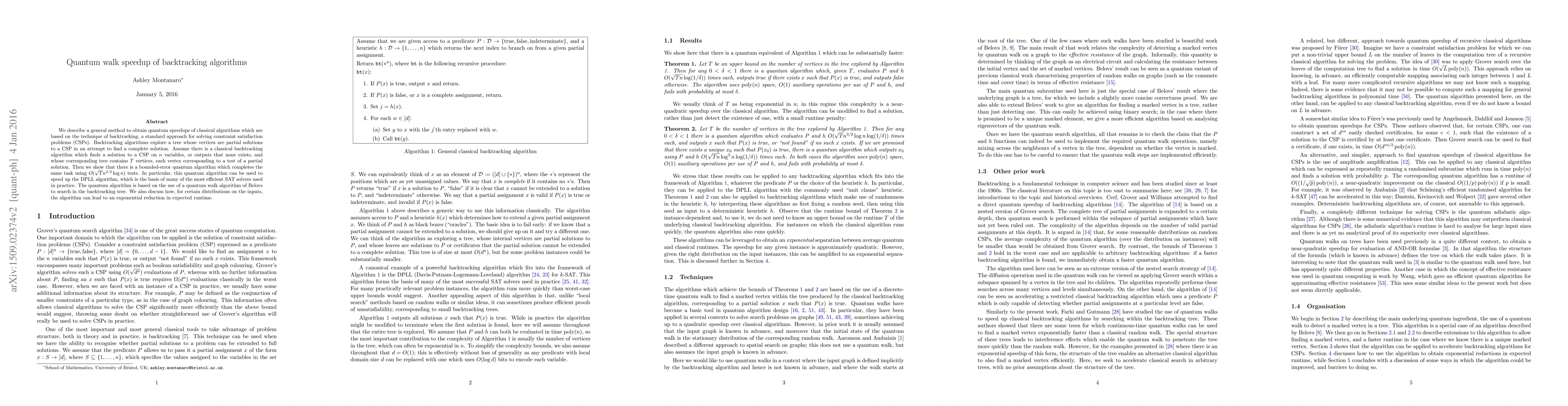 We describe a general method to obtain quantum speedups of classical algorithms which are based on the technique of backtracking, a standard approach for solving constraint satisfaction problems (CSPs). Backtracking algorithms explore a tree whose vertices are partial solutions to a CSP in an attempt to find a complete solution. Assume there is a classical backtracking algorithm which finds a solution to a CSP on n variables, or outputs that none exists, and whose corresponding tree contains T vertices, each vertex corresponding to a test of a partial solution. Then we show that there is a bounded-error quantum algorithm which completes the same task using O(sqrt(T) n^(3/2) log n) tests. In particular, this quantum algorithm can be used to speed up the DPLL algorithm, which is the basis of many of the most efficient SAT solvers used in practice. The quantum algorithm is based on the use of a quantum walk algorithm of Belovs to search in the backtracking tree. We also discuss how, for certain distributions on the inputs, the algorithm can lead to an exponential reduction in expected runtime.