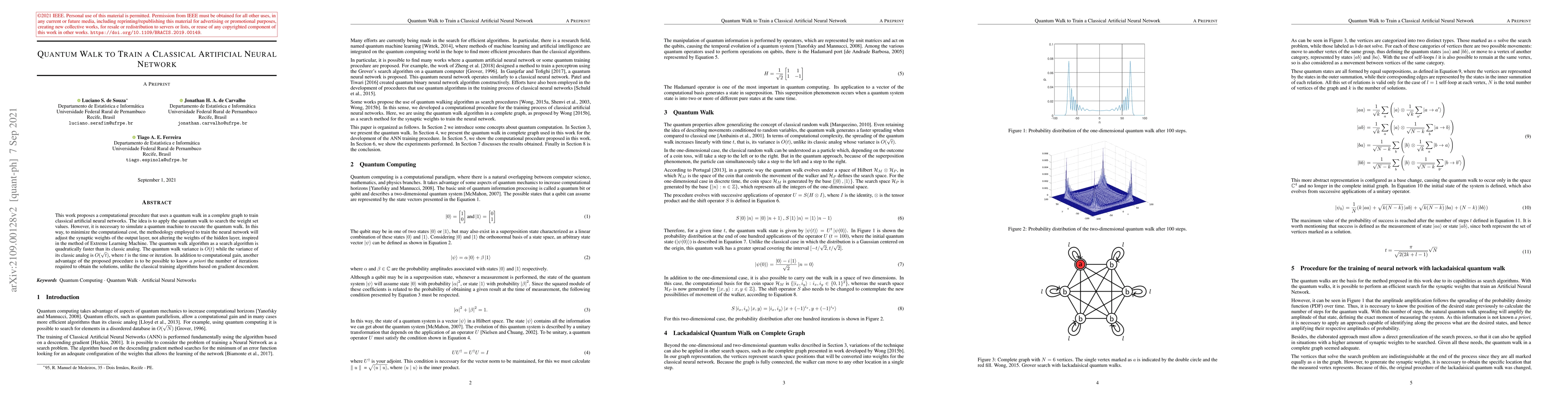 This paper introduces a quantum walk-based method for training classical artificial neural networks, focusing on adjusting only the output layer's weights to minimize computational costs. The quantum walk offers quadratically faster convergence compared to classical methods, providing a predictable number of iterations for training.