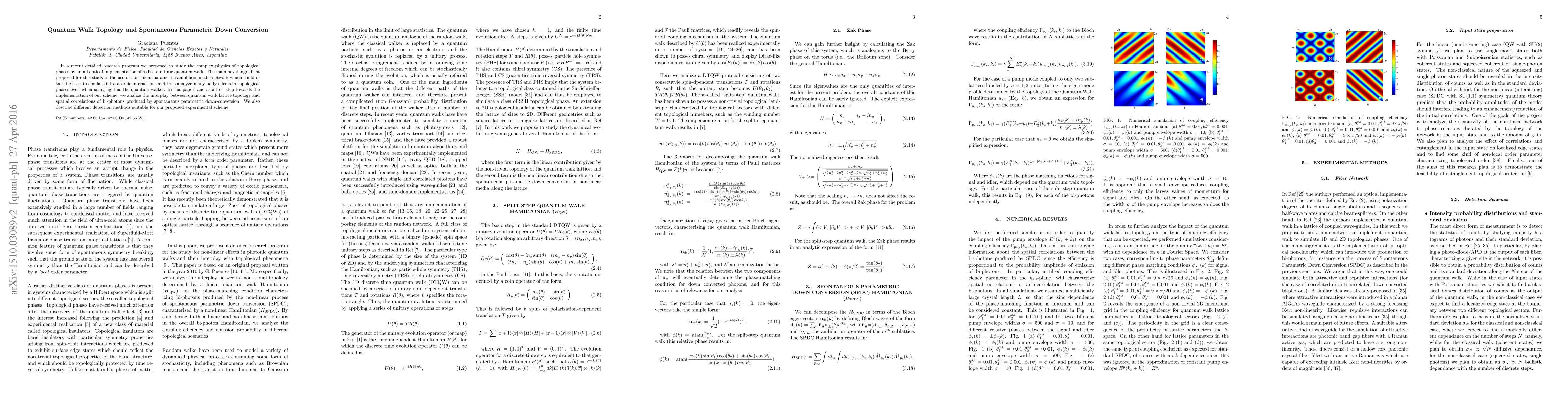 This paper explores the interplay between quantum walk topology and spatial correlations of bi-photons from spontaneous parametric down-conversion, proposing a novel optical implementation of a discrete-time quantum walk using non-linear parametric amplifiers to emulate intra-atomic interactions and analyze many-body effects. It also outlines suitable detection methods for the experimental setup.
