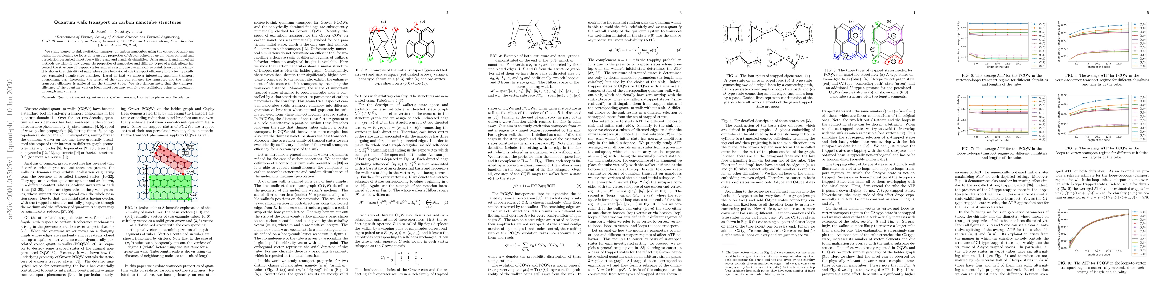 We study source-to-sink excitation transport on carbon nanotubes using the concept of quantum walks. In particular, we focus on transport properties of Grover coined quantum walks on ideal and percolation perturbed nanotubes with zig-zag and armchair chiralities. Using analytic and numerical methods we identify how geometric properties of nanotubes and different types of a sink altogether control the structure of trapped states and, as a result, the overall source-to-sink transport efficiency. It is shown that chirality of nanotubes splits behavior of the transport efficiency into a few typically well separated quantitative branches. Based on that we uncover interesting quantum transport phenomena, e.g. increasing the length of the tube can enhance the transport and the highest transport efficiency is achieved for the thinnest tube. We also demonstrate, that the transport efficiency of the quantum walk on ideal nanotubes may exhibit even oscillatory behavior dependent on length and chirality.