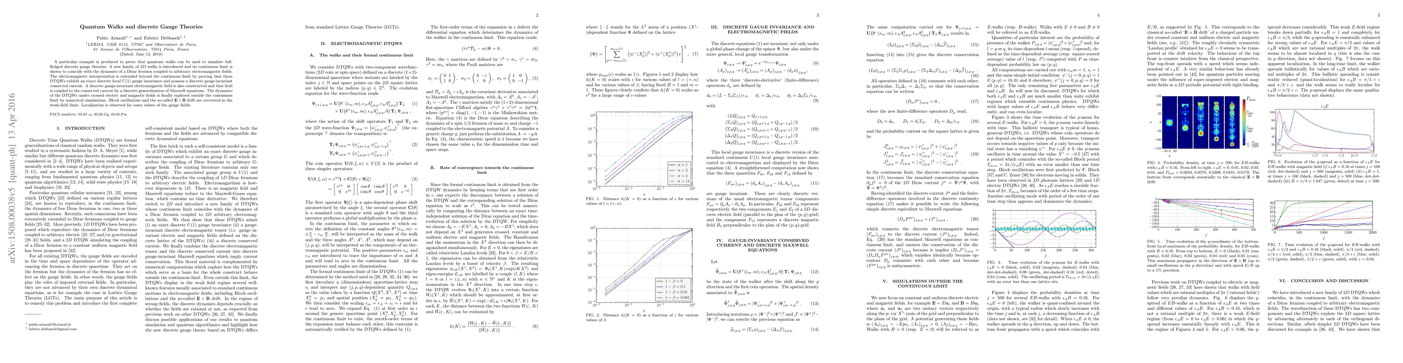 This paper demonstrates that quantum walks can simulate discrete gauge theories, introducing a new family of 2D walks that exhibit exact discrete local $U(1)$ gauge invariance and a conserved current. Numerical simulations reveal Bloch oscillations and ${\bf E} \times {\bf B}$ drift, alongside localization under certain gauge field conditions.