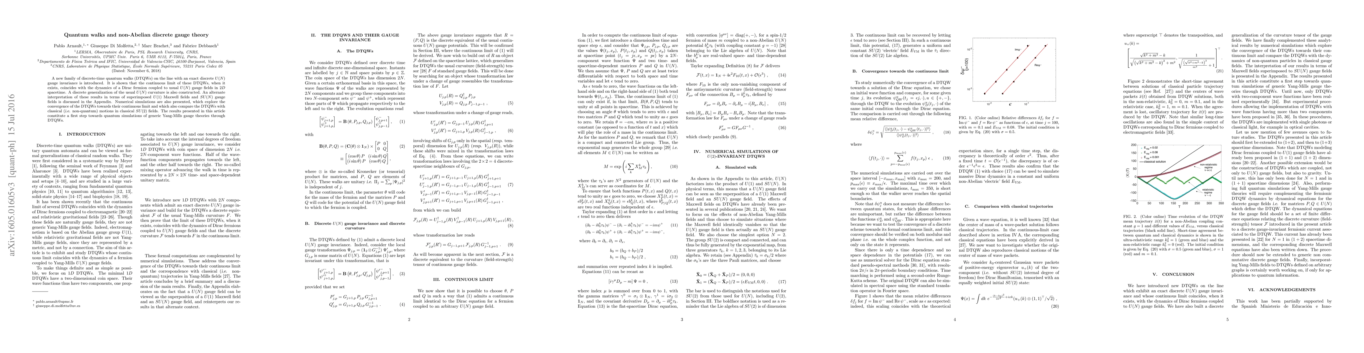 A new family of discrete-time quantum walks (DTQWs) on the line with an exact discrete $U(N)$ gauge invariance is introduced. It is shown that the continuous limit of these DTQWs, when it exists, coincides with the dynamics of a Dirac fermion coupled to usual $U(N)$ gauge fields in $2D$ spacetime. A discrete generalization of the usual $U(N)$ curvature is also constructed. An alternate interpretation of these results in terms of superimposed $U(1)$ Maxwell fields and $SU(N)$ gauge fields is discussed in the Appendix. Numerical simulations are also presented, which explore the convergence of the DTQWs towards their continuous limit and which also compare the DTQWs with classical (i.e. non-quantum) motions in classical $SU(2)$ fields. The results presented in this article constitute a first step towards quantum simulations of generic Yang-Mills gauge theories through DTQWs.