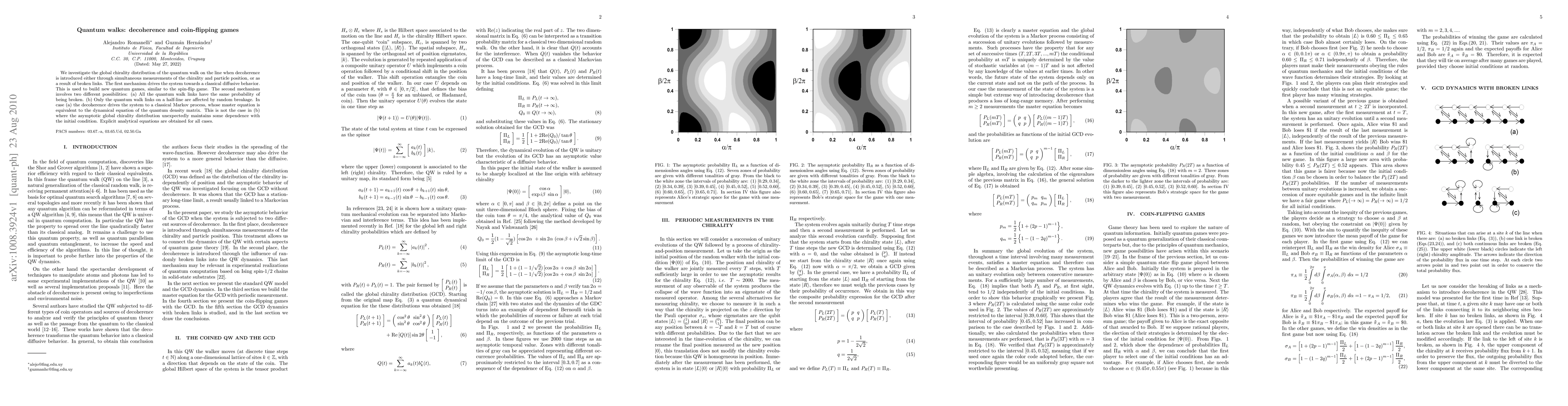 We investigate the global chirality distribution of the quantum walk on the line when decoherence is introduced either through simultaneous measurements of the chirality and particle position, or as a result of broken links. The first mechanism drives the system towards a classical diffusive behavior. This is used to build new quantum games, similar to the spin-flip game. The second mechanism involves two different possibilities: (a) All the quantum walk links have the same probability of being broken. (b) Only the quantum walk links on a half-line are affected by random breakage. In case (a) the decoherence drives the system to a classical Markov process, whose master equation is equivalent to the dynamical equation of the quantum density matrix. This is not the case in (b) where the asymptotic global chirality distribution unexpectedly maintains some dependence with the initial condition. Explicit analytical equations are obtained for all cases.