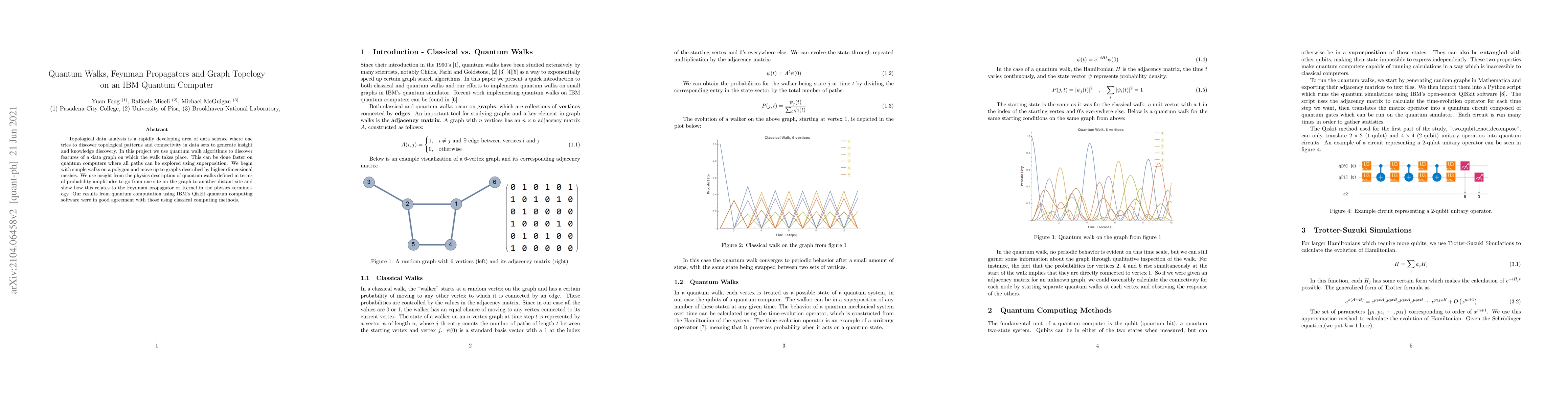 Topological data analysis is a rapidly developing area of data science where one tries to discover topological patterns in data sets to generate insight and knowledge discovery. In this project we use quantum walk algorithms to discover features of a data graph on which the walk takes place. This can be done faster on quantum computers where all paths can be explored using superposition. We begin with simple walks on a polygon and move up to graphs described by higher dimensional meshes. We use insight from the physics description of quantum walks defined in terms of probability amplitudes to go from one site on a graph to another distant site and show how this relates to the Feynman propagator or Kernel in the physics terminology. Our results from quantum computation using IBM's Qiskit quantum computing software were in good agreement with those obtained using classical computing methods.