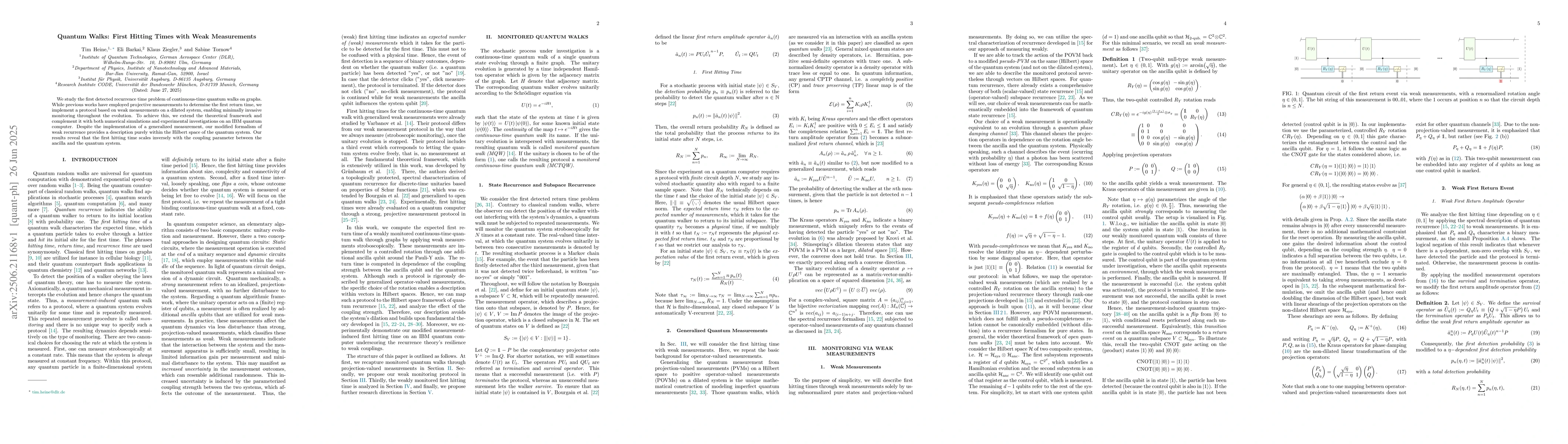 This research introduces a novel approach using weak measurements to study the first recurrence time of continuous-time quantum walks on graphs. By implementing this method on an IBM quantum computer, the study confirms that the first hitting time is inversely proportional to the coupling parameter between the ancilla and the quantum system, all within the system's Hilbert space.