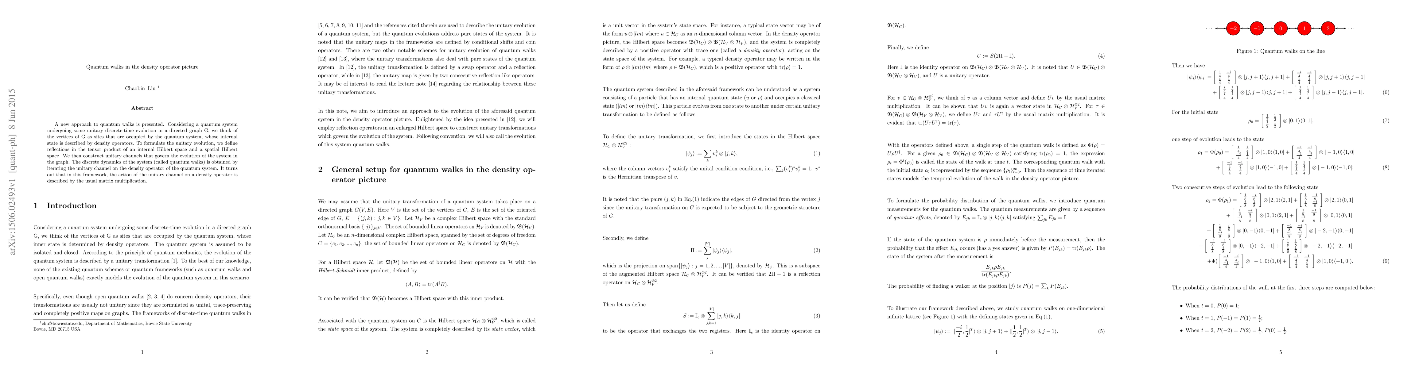 This paper introduces a novel framework for quantum walks using density operators, where the quantum system's internal state is described by density operators. The authors define unitary channels that govern the evolution of the system on a directed graph, and the dynamics are obtained by iterating these channels on the density operator, with matrix multiplication describing the unitary channel's action.