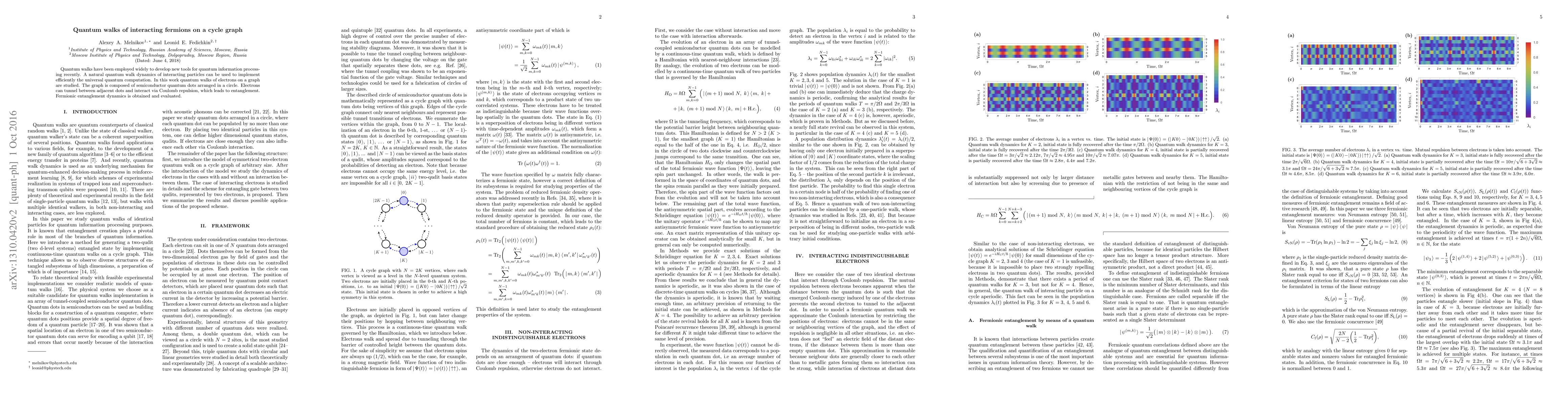 The work introduces a systematic analysis of quantum walks of interacting fermions on cycle graphs, offering a novel approach to quantum information processing using entangled fermionic states derived from free quantum evolution.