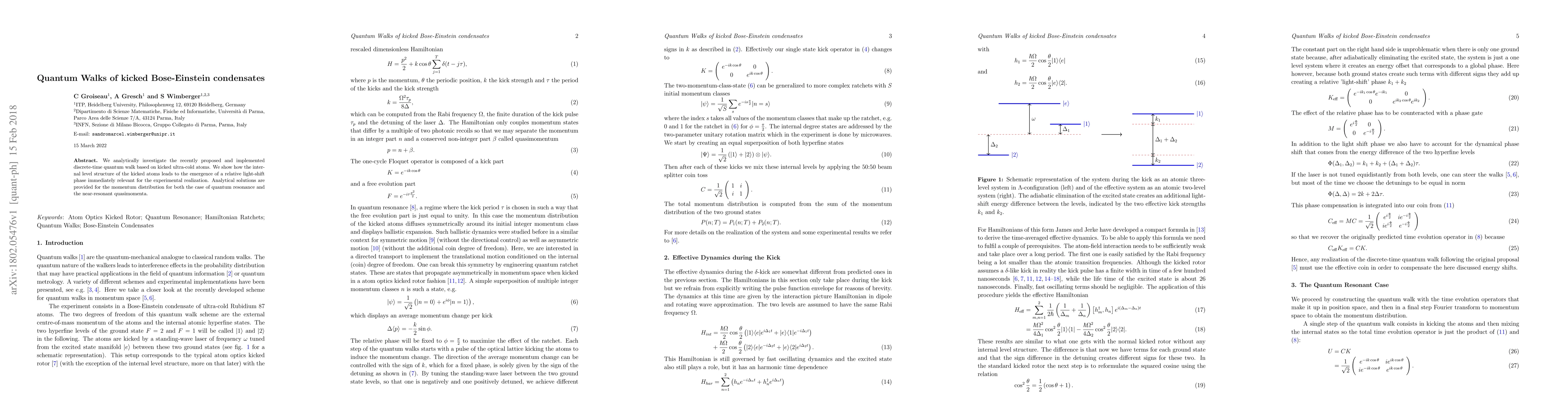 This paper analytically explores quantum walks in kicked Bose-Einstein condensates, demonstrating how the internal atomic structure influences a light-shift phase crucial for experimental setups. It provides analytical solutions for momentum distributions under both quantum resonance and near-resonant quasimomenta conditions.