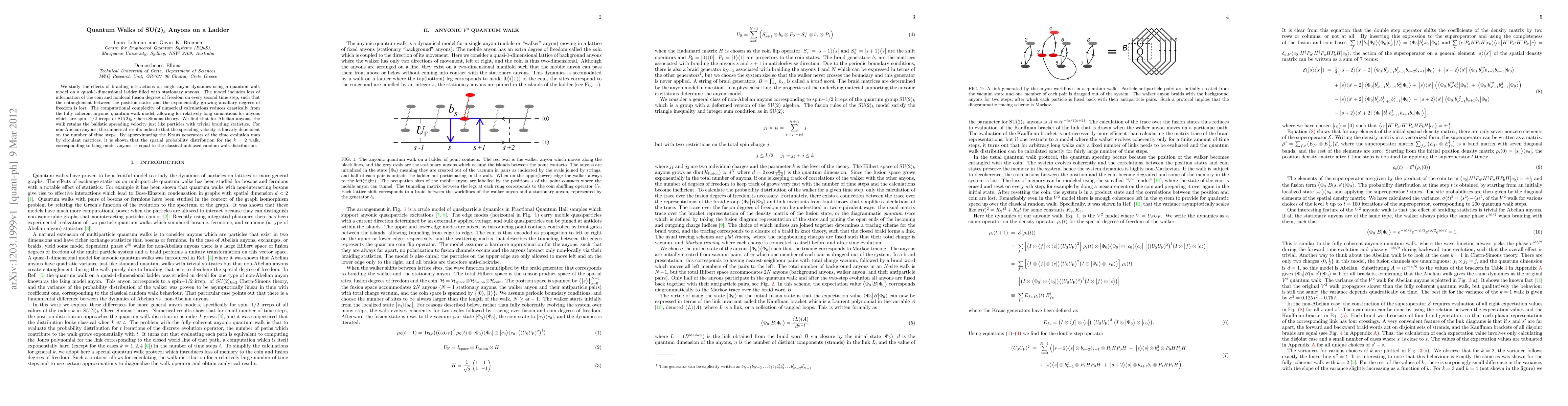 This paper investigates quantum walks of SU(2)_k anyons on a ladder, revealing reduced computational complexity and dynamics influenced by braiding interactions. For Abelian anyons, the walk maintains ballistic spreading, while non-Abelian anyons show linear spreading velocity dependence on time steps, with k=2 anyons exhibiting a classical random walk distribution.