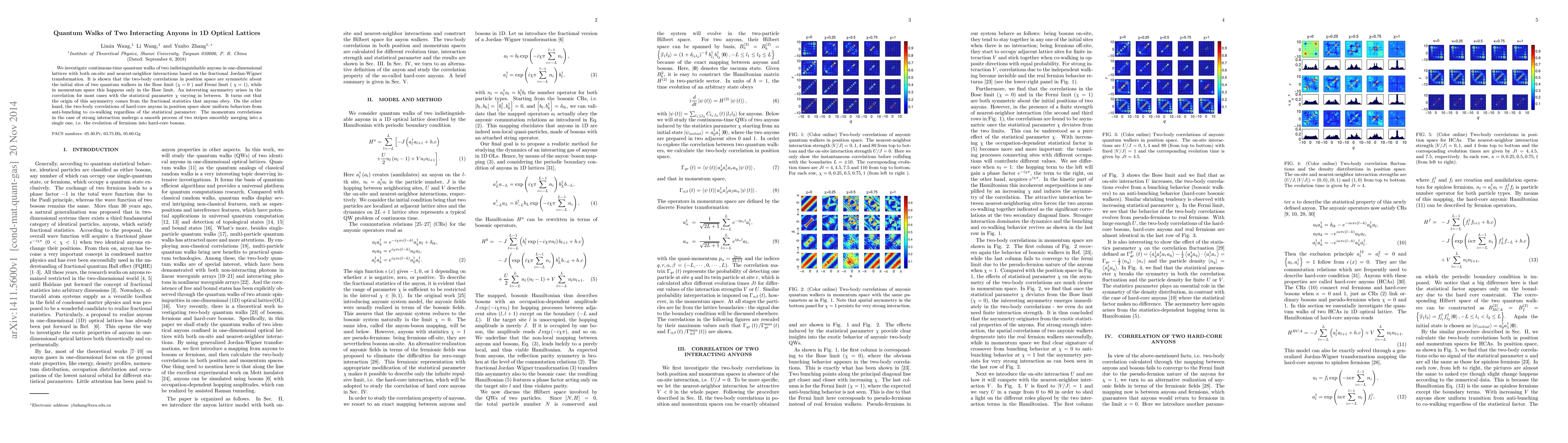 This paper explores quantum walks of two interacting anyons in 1D optical lattices, revealing symmetric two-body correlations in position space for both Bose and Fermi limits, while momentum space correlations are symmetric only in the Bose limit. The asymmetry in intermediate statistical parameters stems from fractional statistics, contrasting with uniform behavior in hard-core anyons.
