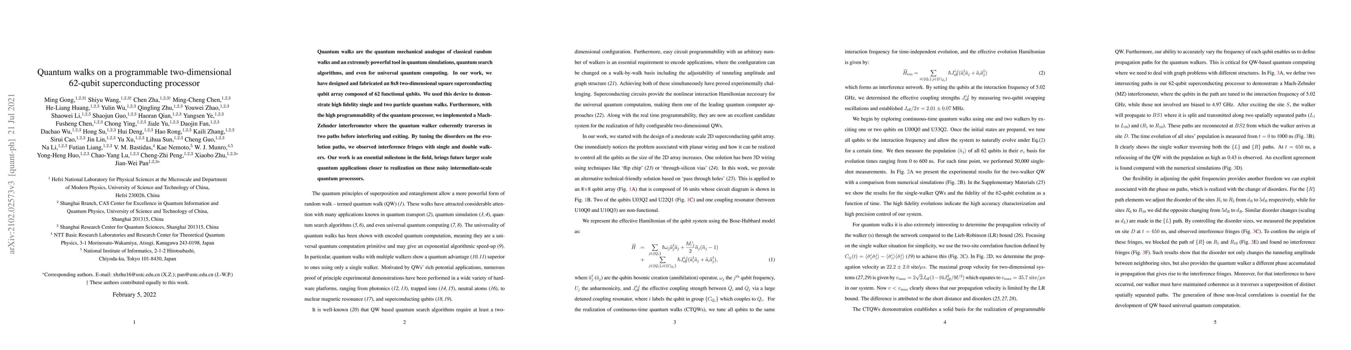This research demonstrates high-fidelity quantum walks on a 62-qubit superconducting processor, showcasing single and two-particle walks and implementing a Mach-Zehnder interferometer to observe interference fringes, marking a significant step towards larger-scale quantum applications.