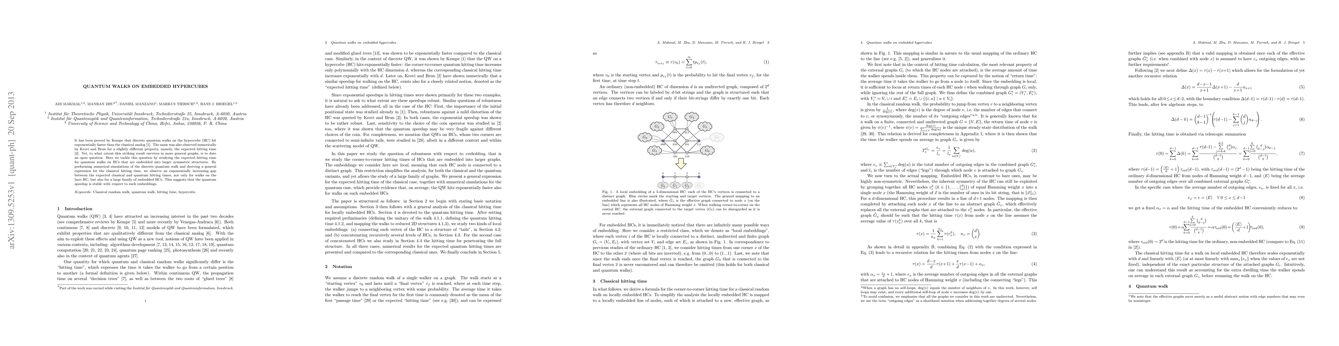 Quantum walks on embedded hypercubes show an exponentially increasing gap between classical and quantum hitting times, suggesting the quantum speedup is stable with respect to graph embeddings.