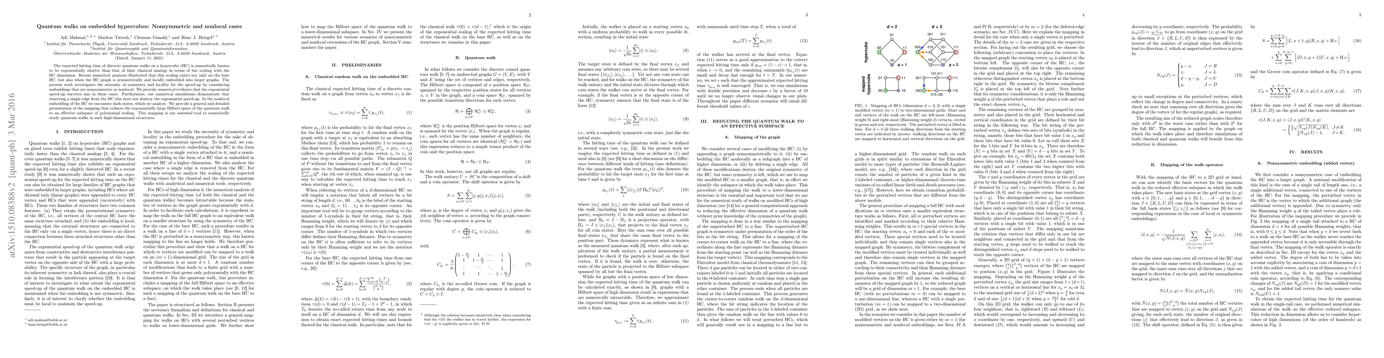 The expected hitting time of discrete quantum walks on a hypercube (HC) is numerically known to be exponentially shorter than that of their classical analogs in terms of the scaling with the HC dimension. Recent numerical analyses illustrated that this scaling exists not only on the bare HC, but also when the HC graph is symmetrically and locally embedded into larger graphs. The present work investigates the necessity of symmetry and locality for the speed-up by considering embeddings that are nonsymmetric or nonlocal. We provide numerical evidence that the exponential speed-up survives also in these cases. Furthermore, our numerical simulations demonstrate that removing a single edge from the HC also does not destroy the exponential speed-up. In the nonlocal embedding of the HC we encounter dark states, which we analyze. We provide a general and detailed presentation of the mapping that reduces the exponentially large Hilbert space of the quantum walk to an effective subspace of polynomial scaling. This mapping is our essential tool to numerically study quantum walks in such high-dimensional structures.