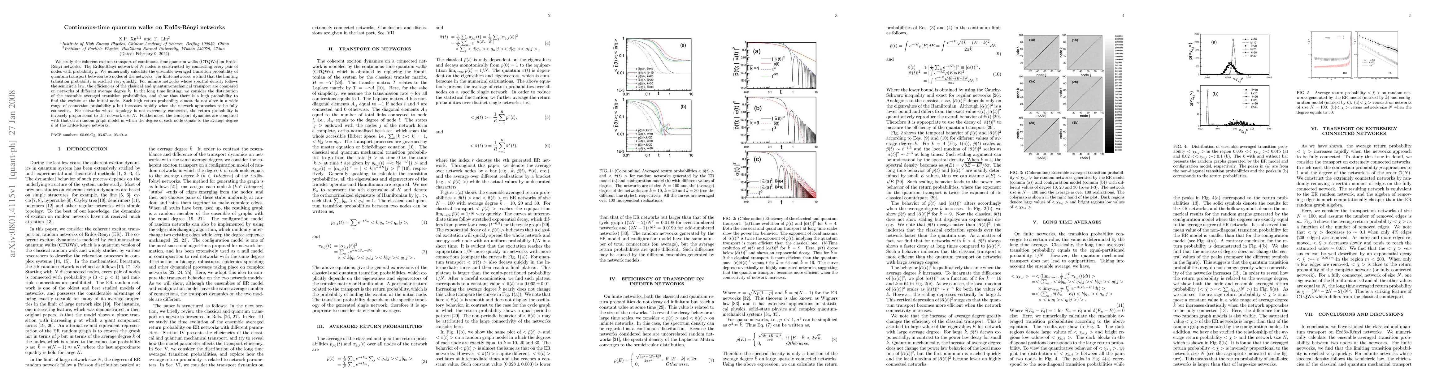 This paper investigates the transport of quantum excitons via continuous-time quantum walks on Erdos-Renyi networks, finding that return probabilities are high and nearly constant over a range of connection probabilities, except when fully connected. The study also compares quantum transport efficiency with classical transport on networks of varying average degrees.