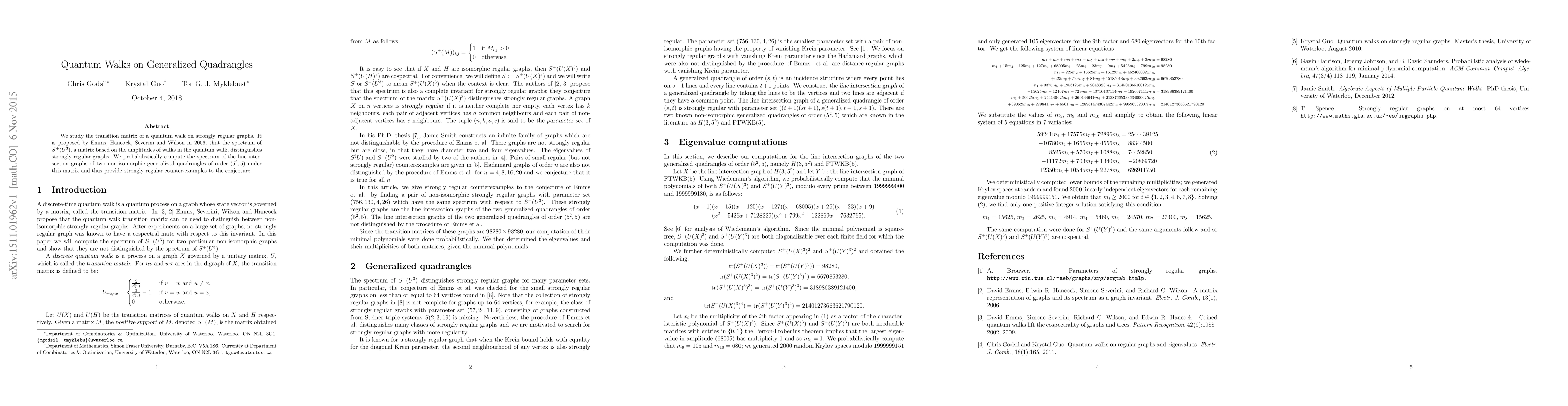 We study the transition matrix of a quantum walk on strongly regular graphs. It is proposed by Emms, Hancock, Severini and Wilson in 2006, that the spectrum of $S^+(U^3)$, a matrix based on the amplitudes of walks in the quantum walk, distinguishes strongly regular graphs. We probabilistically compute the spectrum of the line intersection graphs of two non-isomorphic generalized quadrangles of order $(5^2,5)$ under this matrix and thus provide strongly regular counter-examples to the conjecture.
