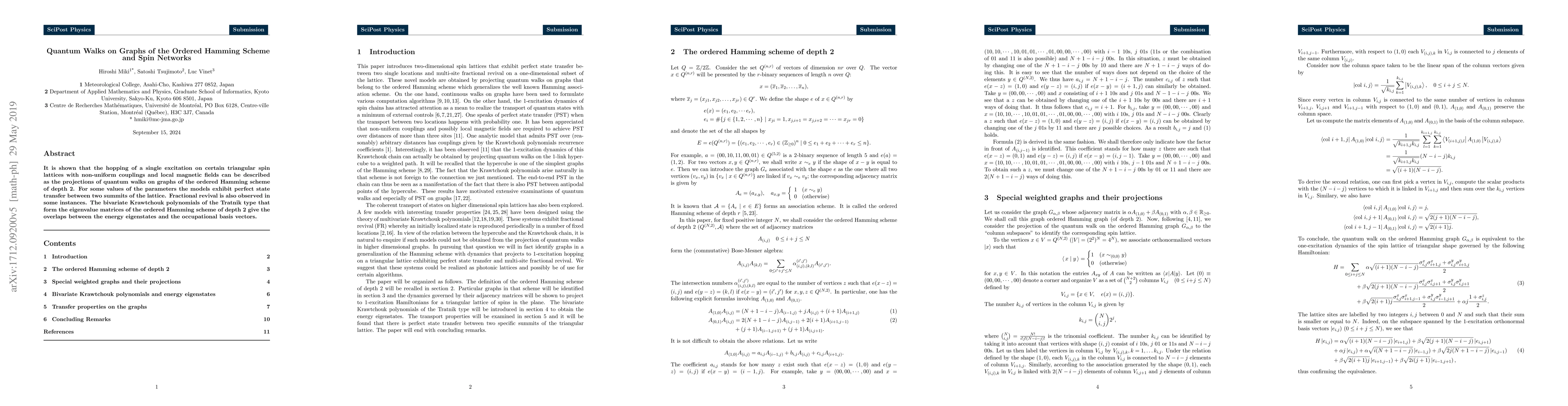 Researchers describe how quantum walks on certain triangular spin lattices can be represented as projections of quantum walks on graphs derived from the ordered Hamming scheme, exhibiting perfect state transfer and fractional revival.