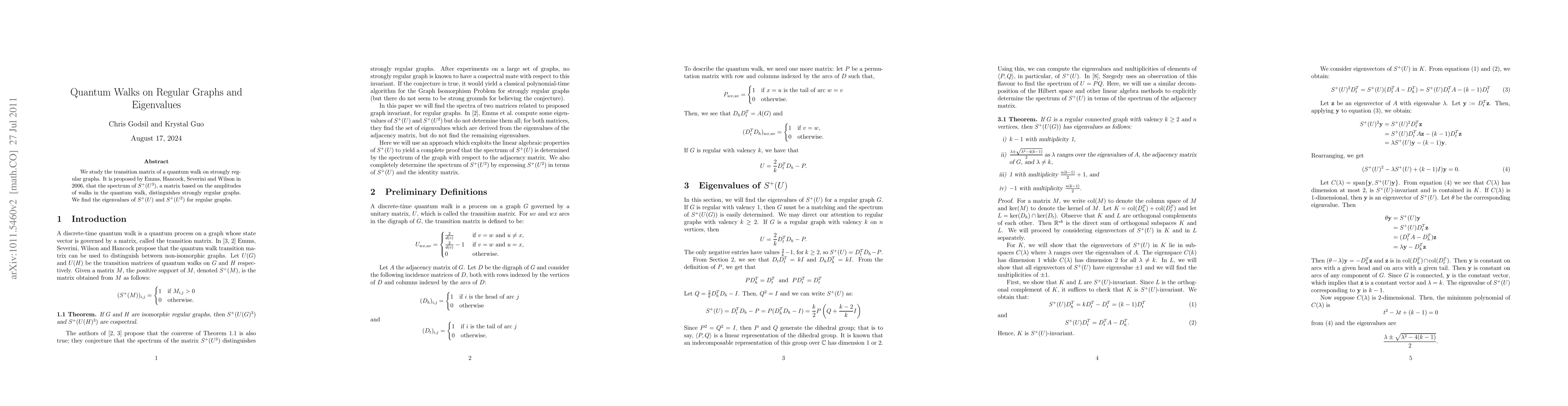 This work contributes to the understanding of quantum walks on regular graphs and their potential application in distinguishing strongly regular graphs, which could lead to advancements in solving the graph isomorphism problem.