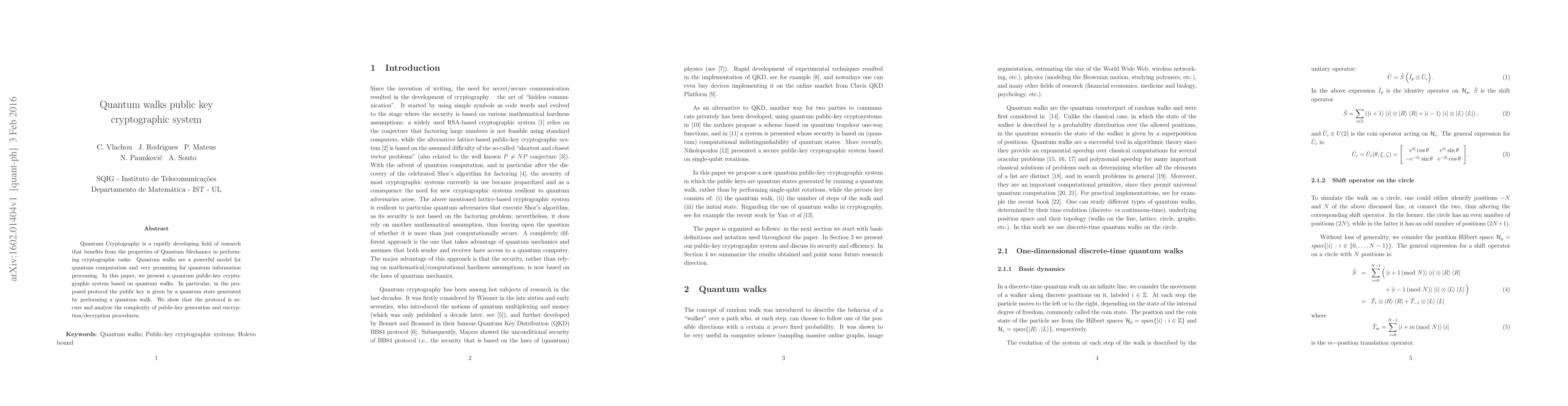 This paper introduces a quantum public-key cryptographic system leveraging quantum walks, where the public key is derived from a quantum state generated by a quantum walk. The authors demonstrate the protocol's security and analyze the computational complexity of key generation and encryption/decryption processes.