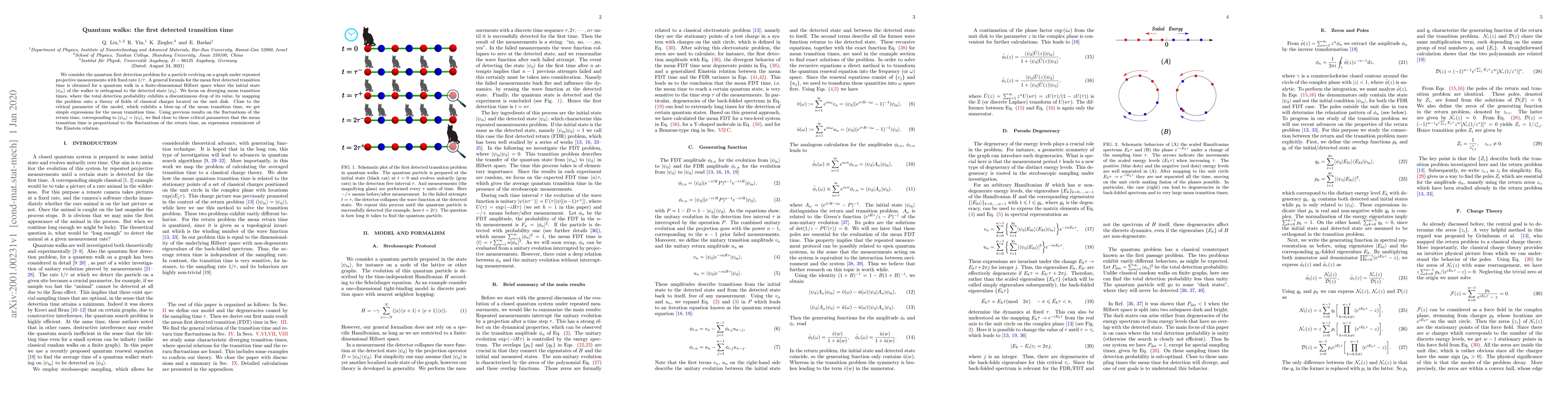We consider the quantum first detection problem for a particle evolving on a graph under repeated projective measurements with fixed rate $1/\tau$. A general formula for the mean first detected transition time is obtained for a quantum walk in a finite-dimensional Hilbert space where the initial state $|\psi_{\rm in}\rangle$ of the walker is orthogonal to the detected state $|\psi_{\rm d}\rangle$. We focus on diverging mean transition times, where the total detection probability exhibits a discontinuous drop of its value, by mapping the problem onto a theory of fields of classical charges located on the unit disk. Close to the critical parameter of the model, which exhibits a blow-up of the mean transition time, we get simple expressions for the mean transition time. Using previous results on the fluctuations of the return time, corresponding to $|\psi_{\rm in}\rangle = |\psi_{\rm d}\rangle$, we find close to these critical parameters that the mean transition time is proportional to the fluctuations of the return time, an expression reminiscent of the Einstein relation.