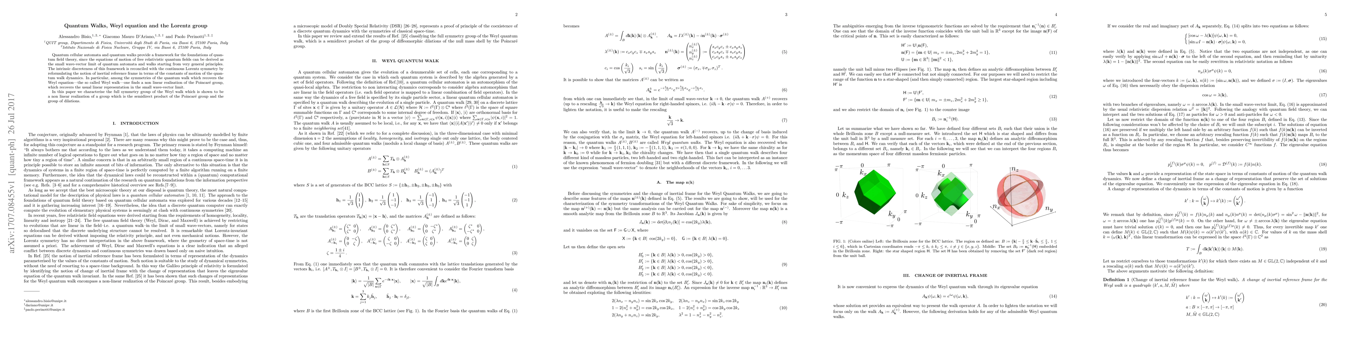 This paper explores the connection between quantum walks and quantum field theory, demonstrating how quantum cellular automata can derive the equations of motion for free relativistic quantum fields. It reveals that the Weyl walk, a quantum walk that recovers the Weyl equation, exhibits a non-linear realization of the Poincaré group, which aligns with the continuous Lorentz symmetry.