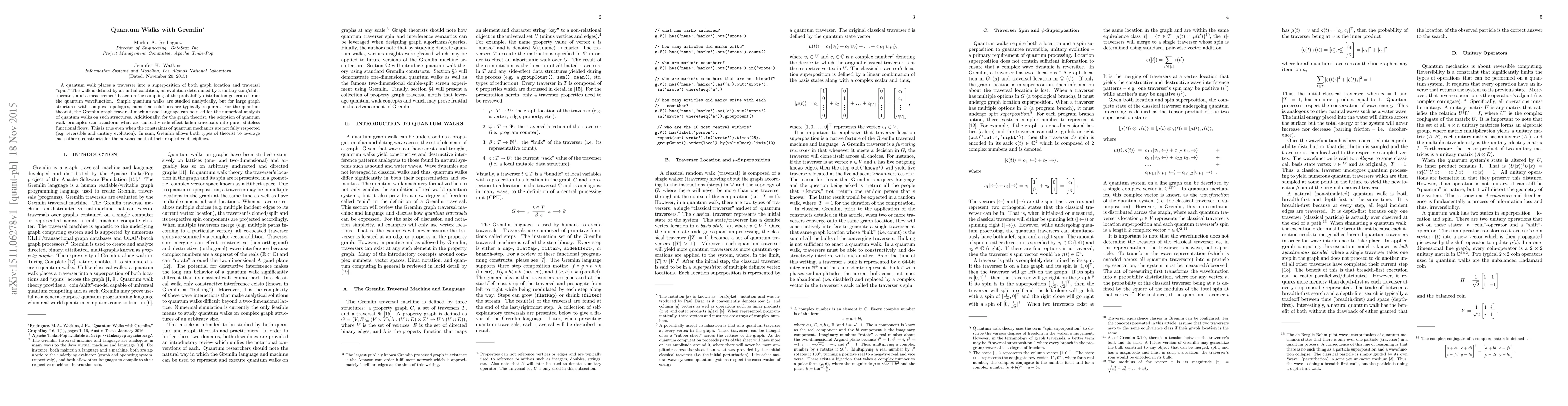 A quantum walk places a traverser into a superposition of both graph location and traversal "spin." The walk is defined by an initial condition, an evolution determined by a unitary coin/shift-operator, and a measurement based on the sampling of the probability distribution generated from the quantum wavefunction. Simple quantum walks are studied analytically, but for large graph structures with complex topologies, numerical solutions are typically required. For the quantum theorist, the Gremlin graph traversal machine and language can be used for the numerical analysis of quantum walks on such structures. Additionally, for the graph theorist, the adoption of quantum walk principles can transform what are currently side-effect laden traversals into pure, stateless functional flows. This is true even when the constraints of quantum mechanics are not fully respected (e.g. reversible and unitary evolution). In sum, Gremlin allows both types of theorist to leverage each other's constructs for the advancement of their respective disciplines.