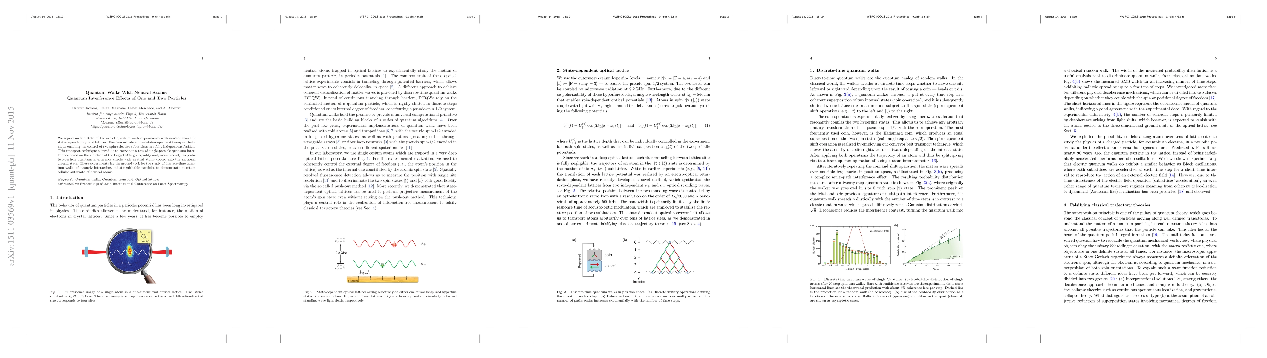 We report on the state of the art of quantum walk experiments with neutral atoms in state-dependent optical lattices. We demonstrate a novel state-dependent transport technique enabling the control of two spin-selective sublattices in a fully independent fashion. This transport technique allowed us to carry out a test of single-particle quantum interference based on the violation of the Leggett-Garg inequality and, more recently, to probe two-particle quantum interference effects with neutral atoms cooled into the motional ground state. These experiments lay the groundwork for the study of discrete-time quantum walks of strongly interacting, indistinguishable particles to demonstrate quantum cellular automata of neutral atoms.